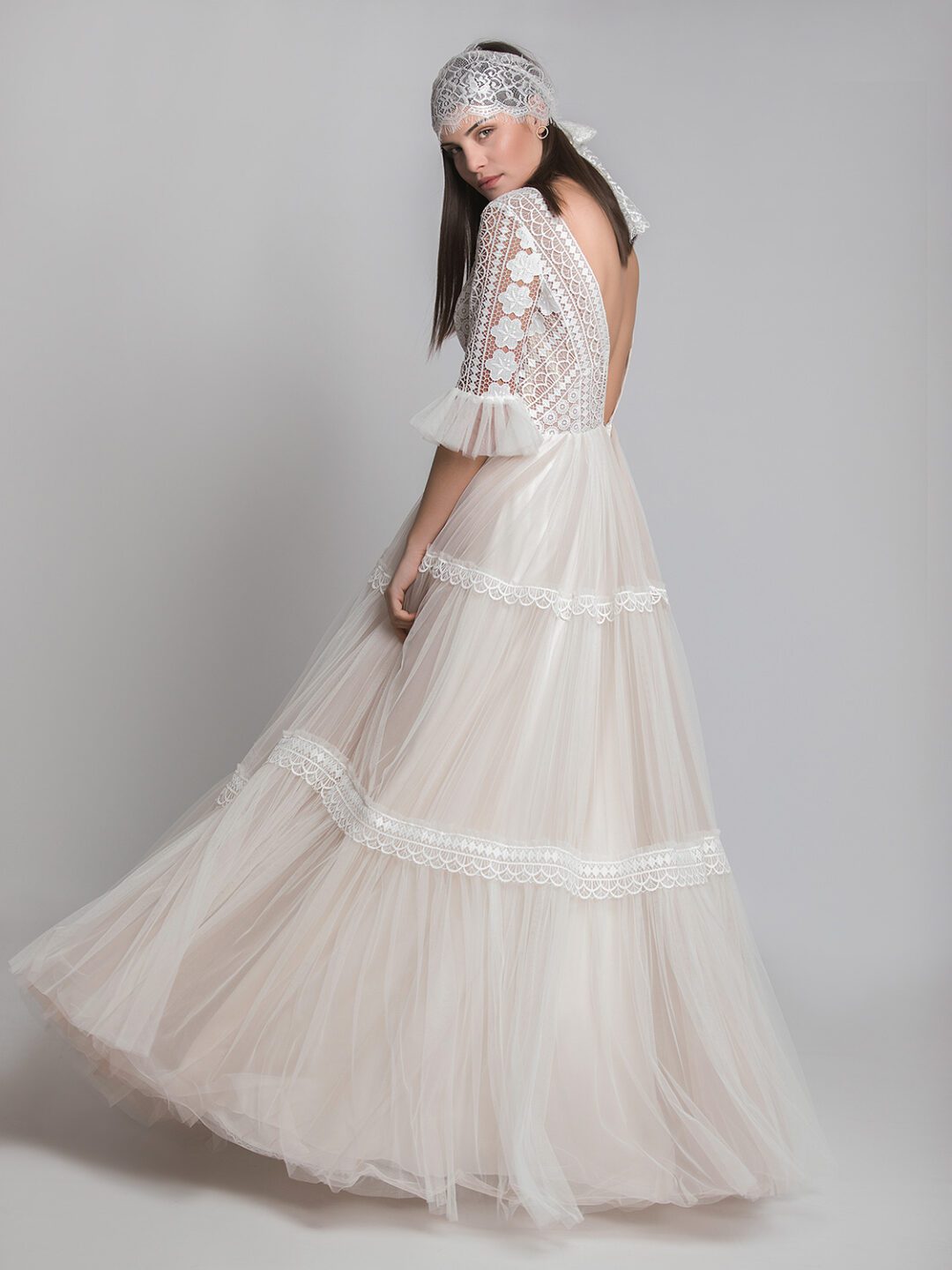 Το απόλυτο boho chic νυφικό φιλοτεχνημένο από μεταξωτό γαλλικό τούλι και κεντημένο με βαμβακερή κιπούρ δαντέλα