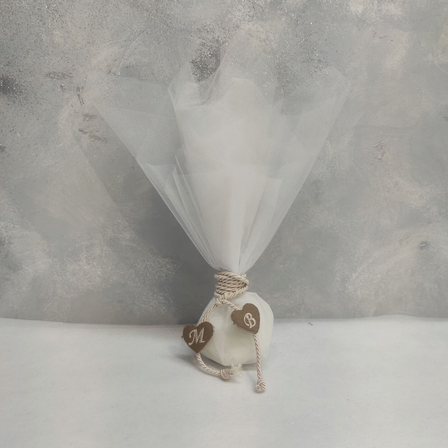 Μπομπονιέρα τούλινη με σχοινάκι και καρδιές με μονόγραμμα