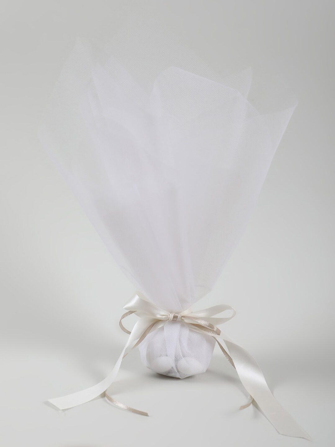 Μπομπονιέρα γάμου από λευκό τούλι με δέσιμο από σατέν κορδέλα και πέρλα