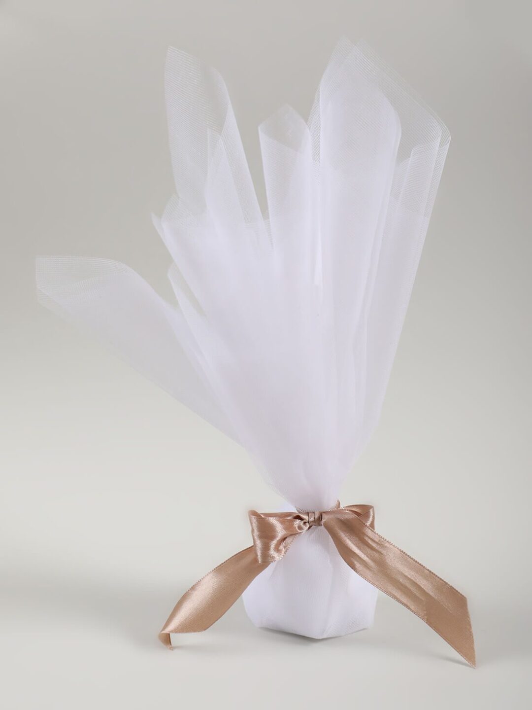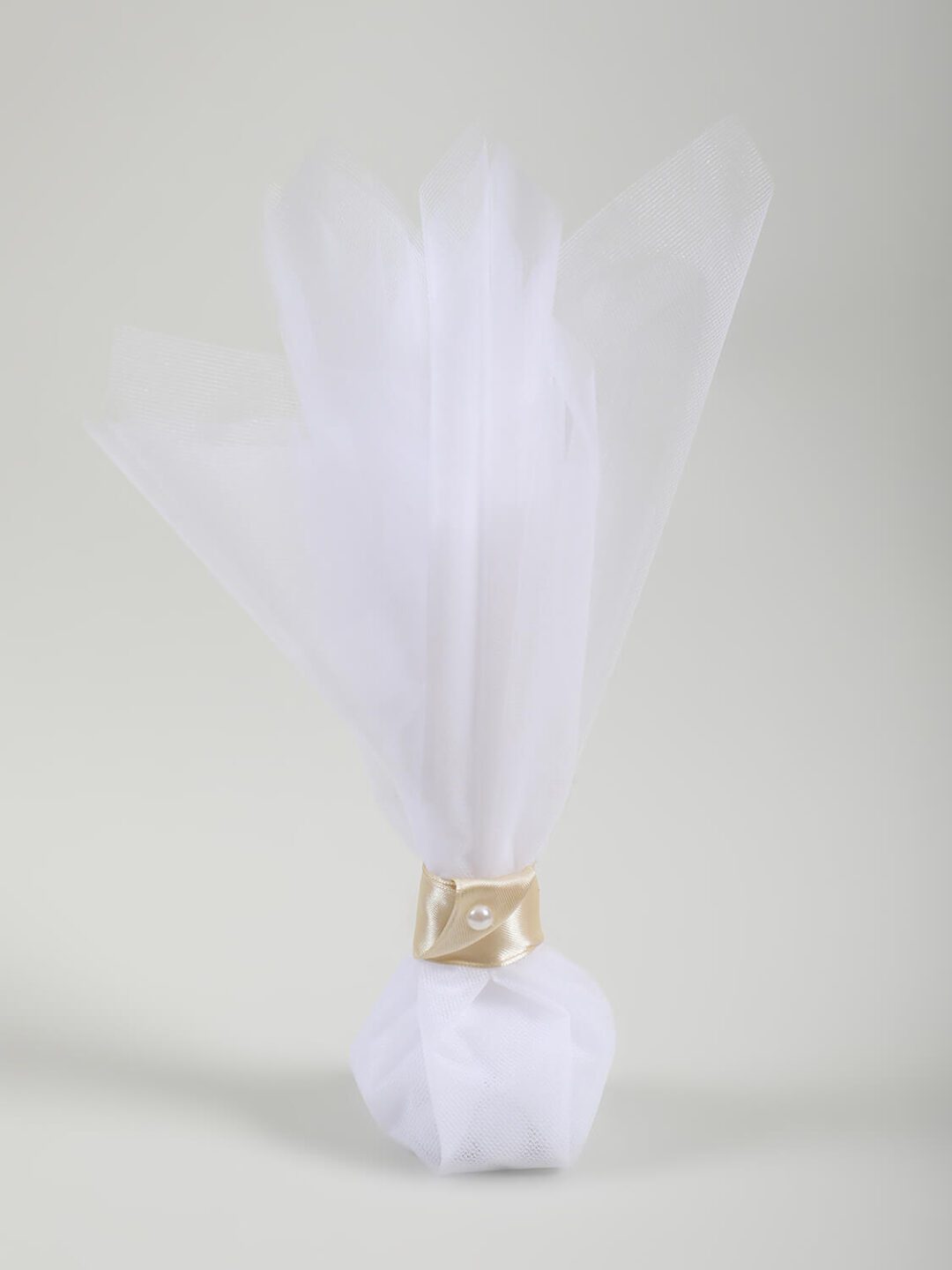 Μπομπονιέρα γάμου από λευκό τούλι, ψιλή, με χοντρή σατέν χρυσή κορδέλα