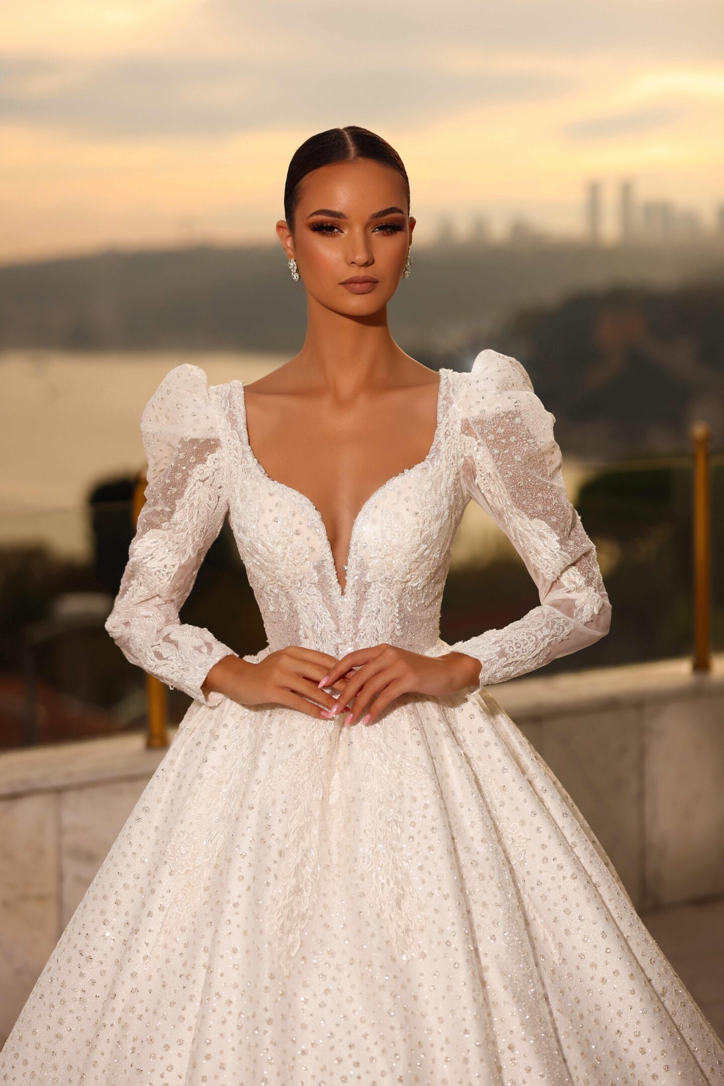 Εντυπωσιακό νυφικό σε γραμμή Α με μακριά μανίκια και κορσέ
