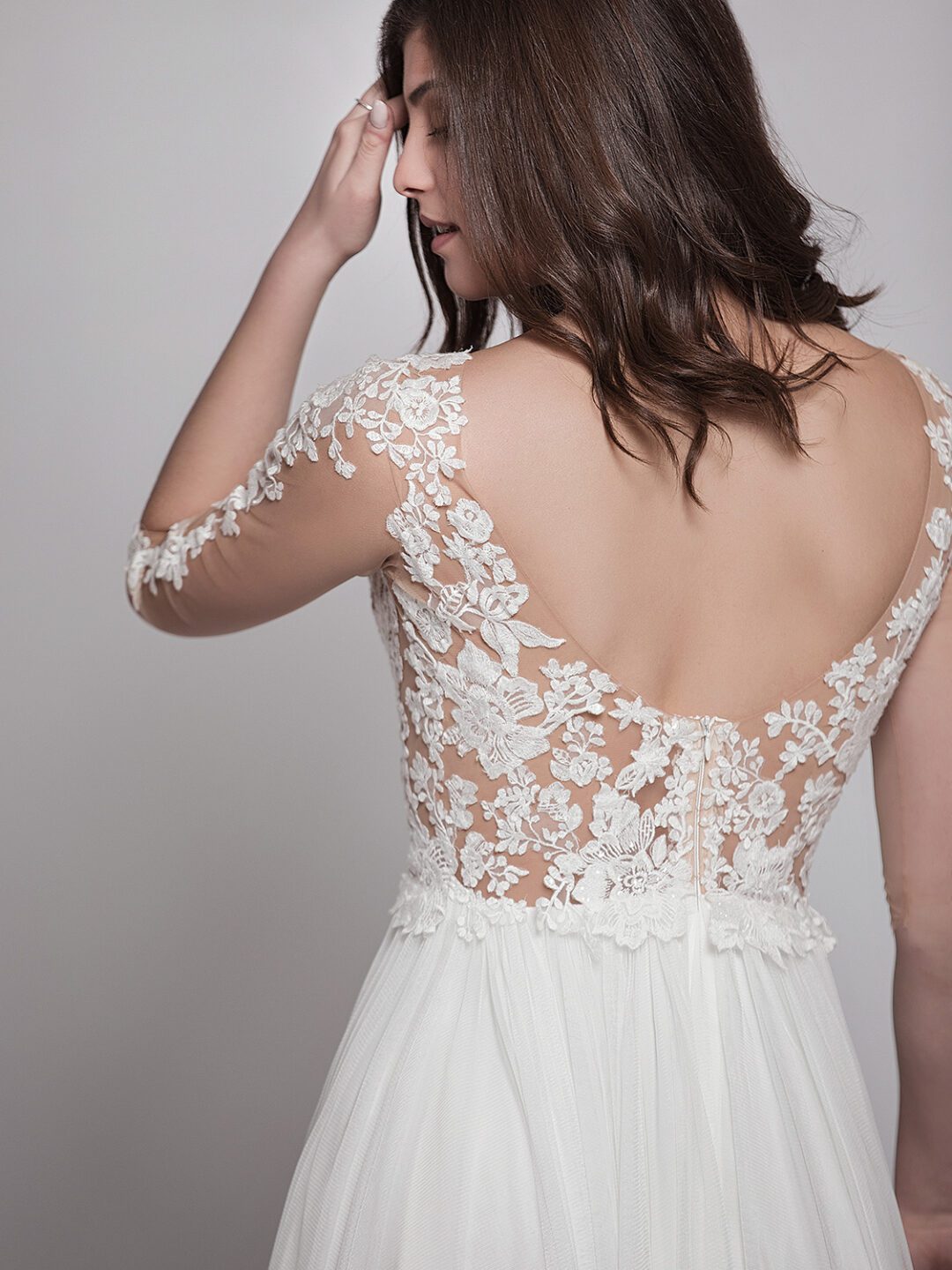 Νυφικό φόρεμα σε άλφα γραμμή με αέρινη μεταξωτή μουσελίνα και γαλλική δαντέλα
