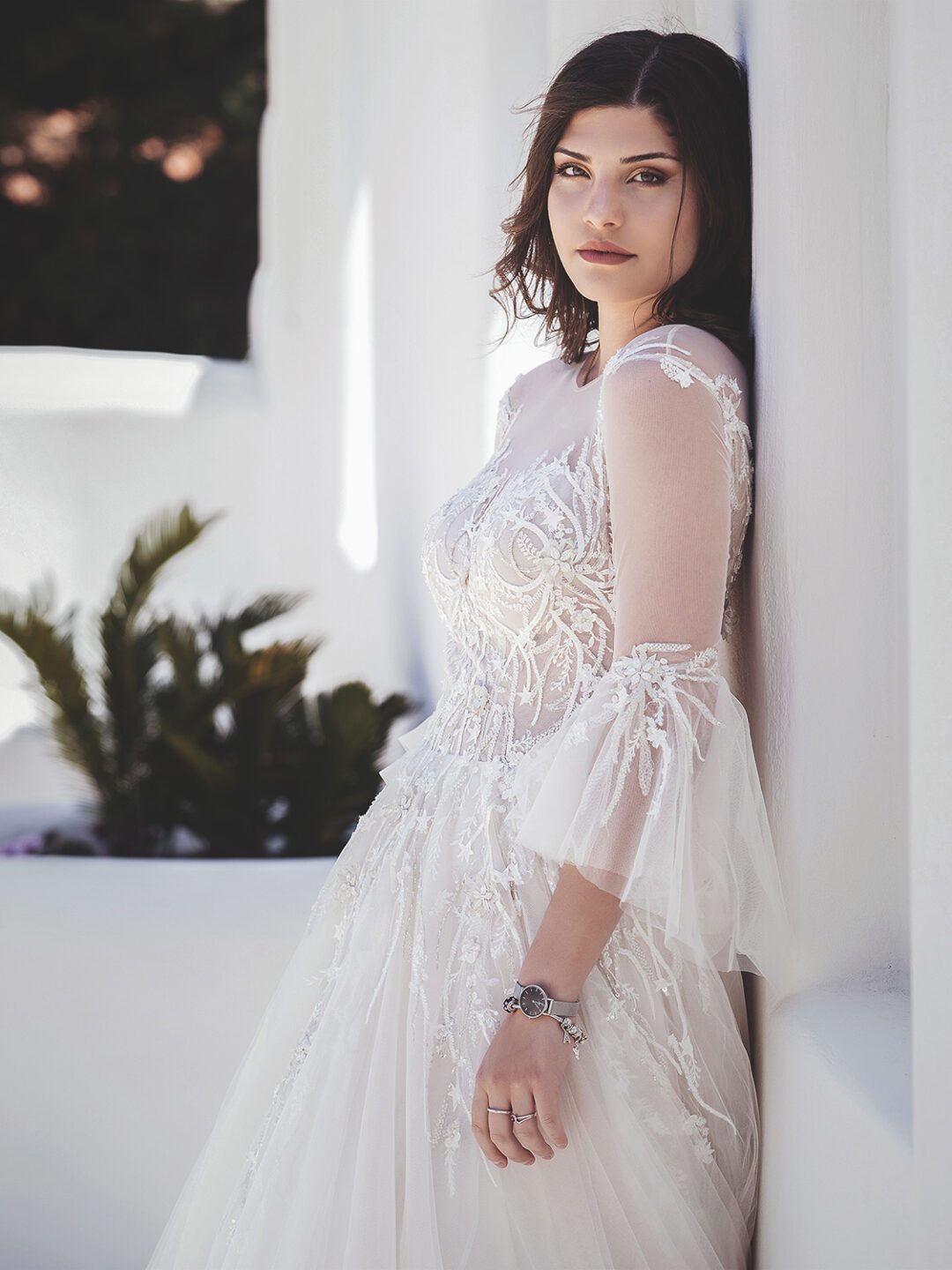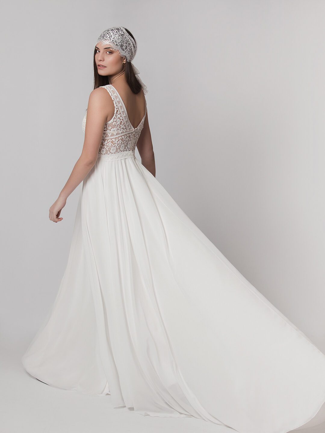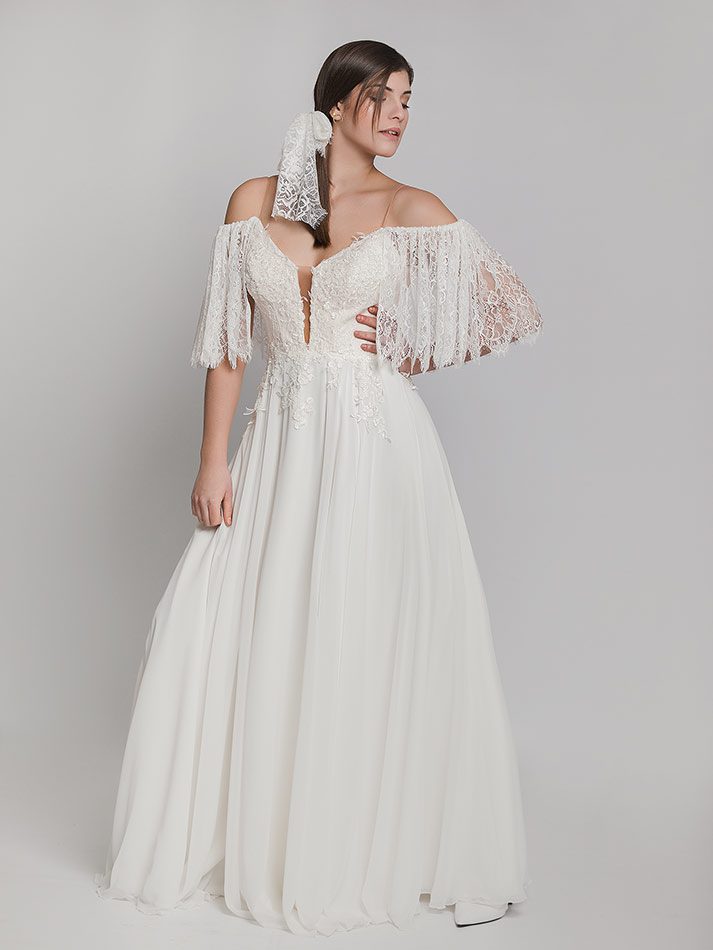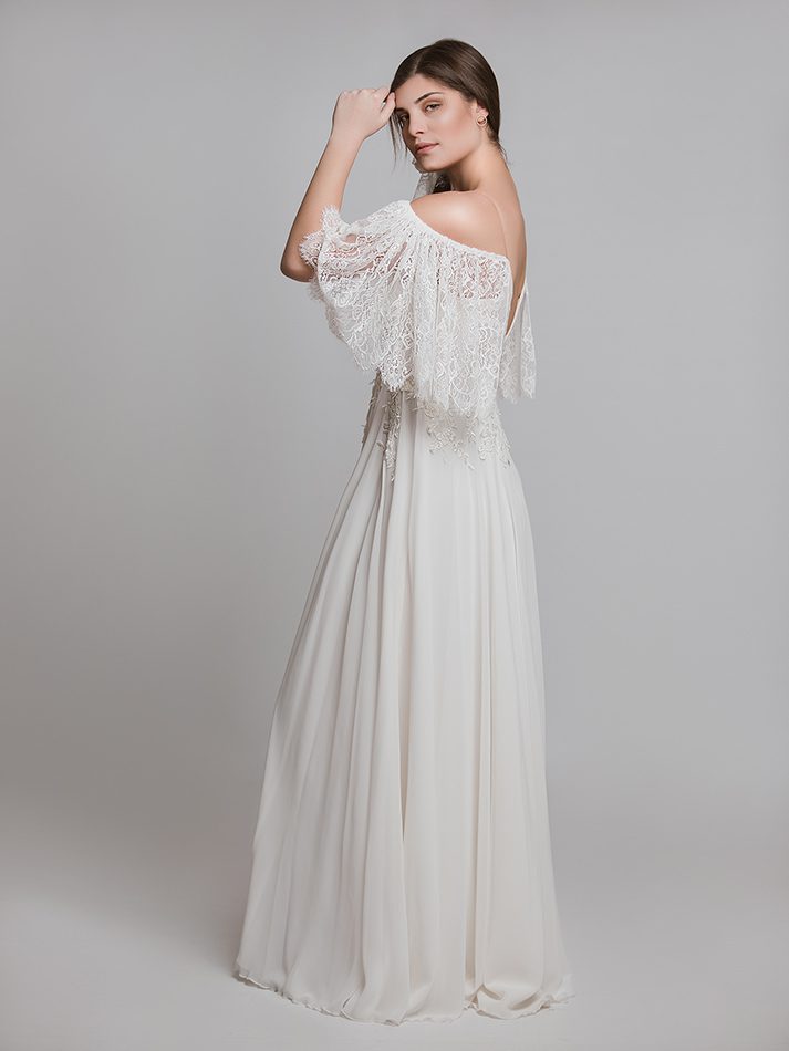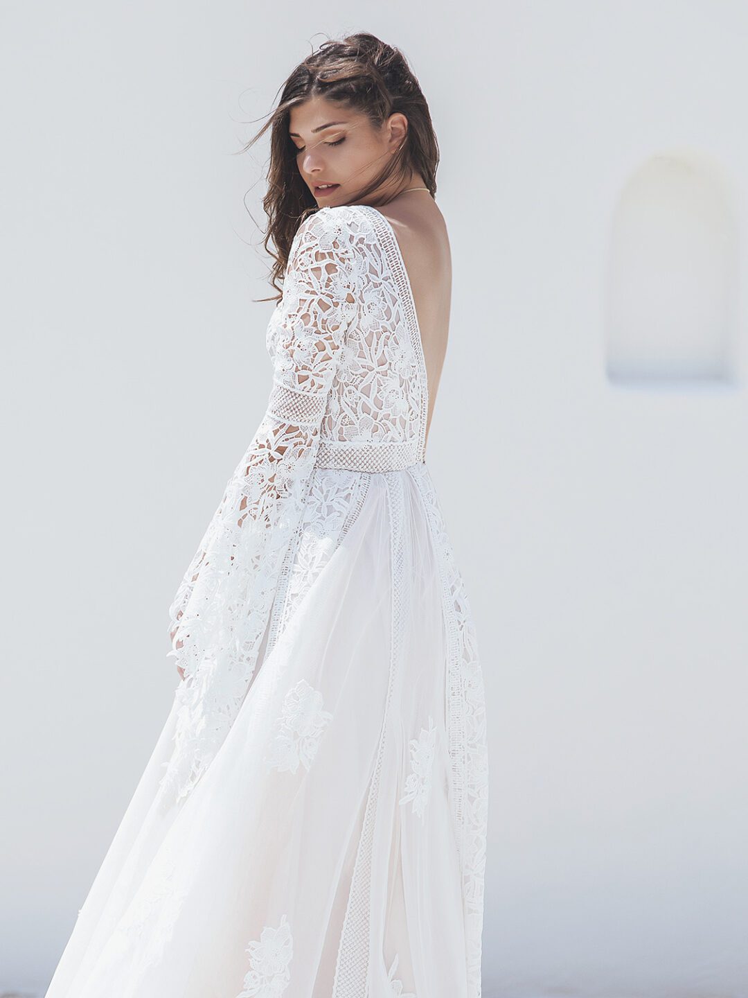 Το απόλυτο boho chic νυφικό φιλοτεχνημένο από μεταξωτό γαλλικό τούλι και κεντημένο με βαμβακερή κιπούρ δαντέλα