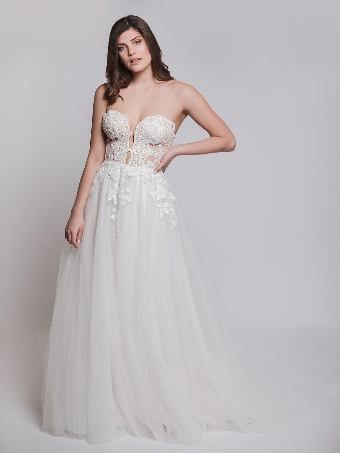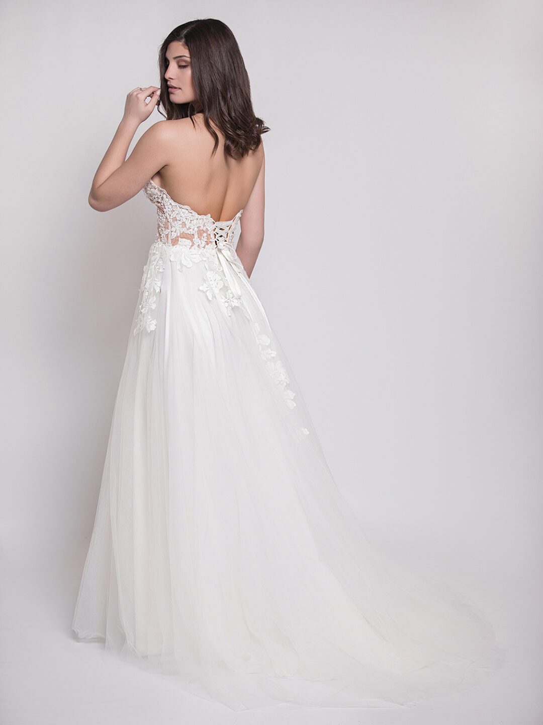 Στράπλες νυφικό από γαλλικό τούλι με μπούστο από γαλλική χειροποίητη δαντέλα, κεντημένο με πέτρες swarovski