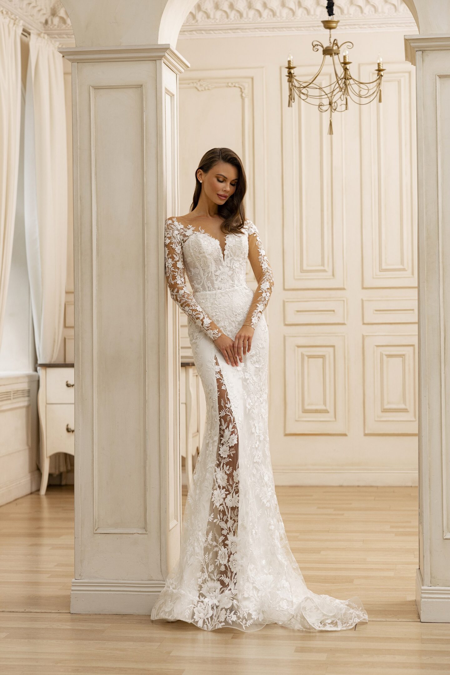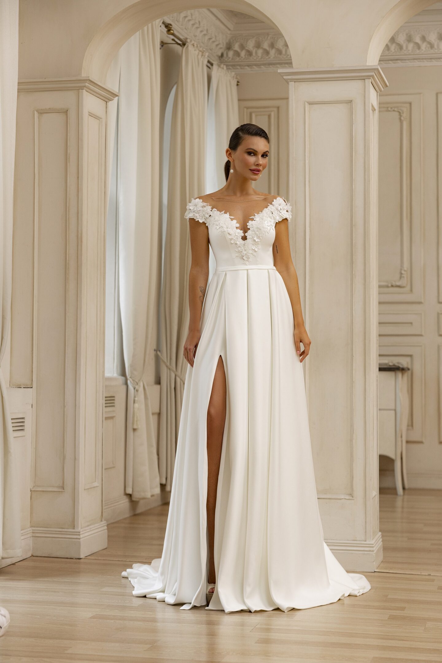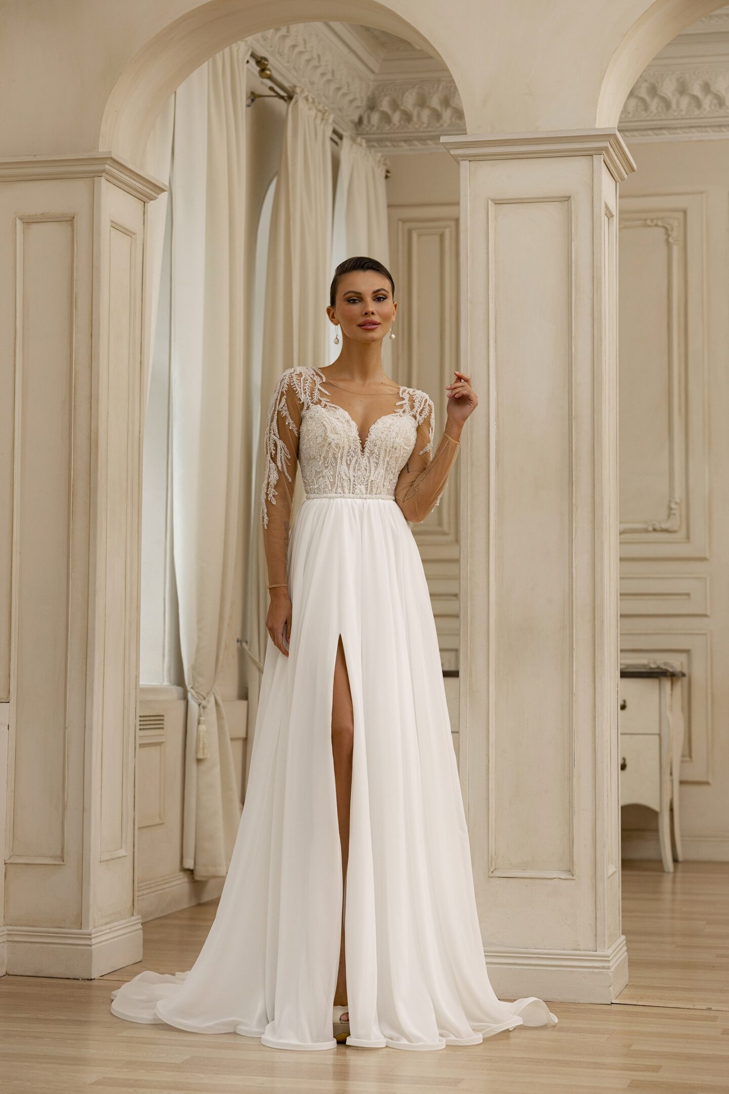 Παραμυθένιο νυφικό με άνοιγμα και μανίκια