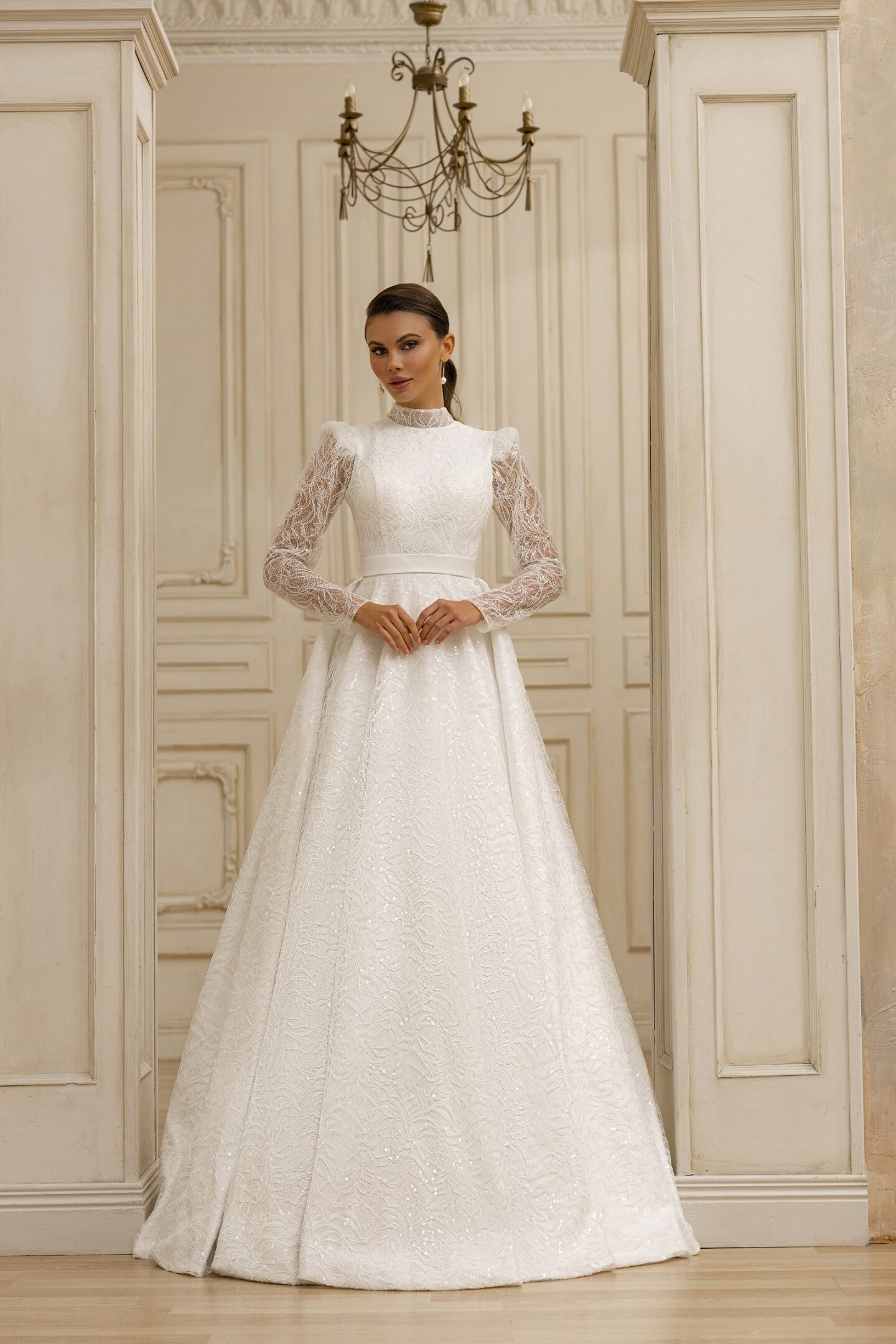 Αρχοντικό νυφικό με μανίκια, βάτες και ουρά