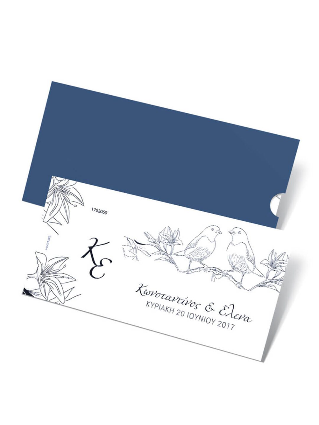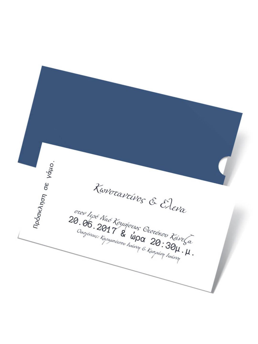 Προσκλητήριο γάμου οριζόντιο, διπλής όψης από χαρτόνι σε χρώμα λευκό με μπλέ