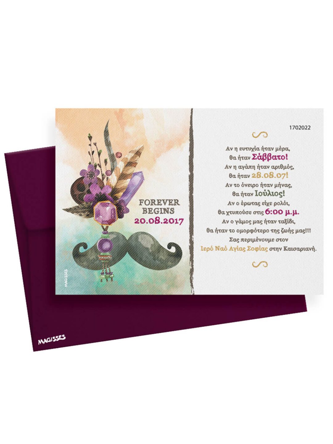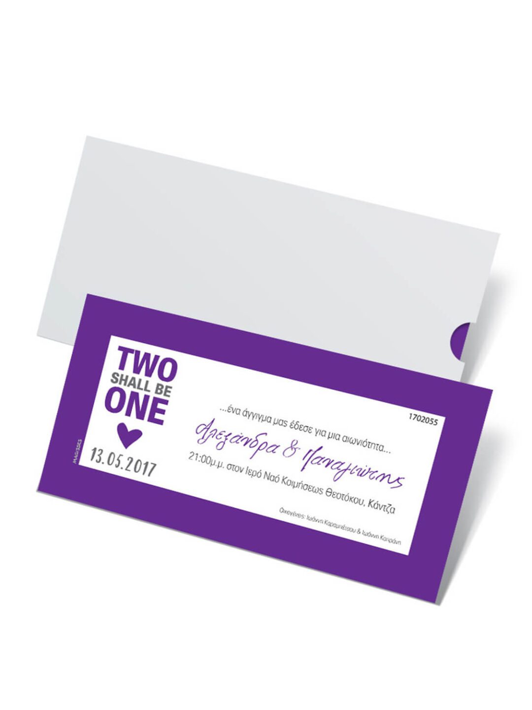 Προσκλητήριο γάμου οριζόντιο, από μεταλιζέ χαρτόνι σε χρώμα εκρού με μωβ