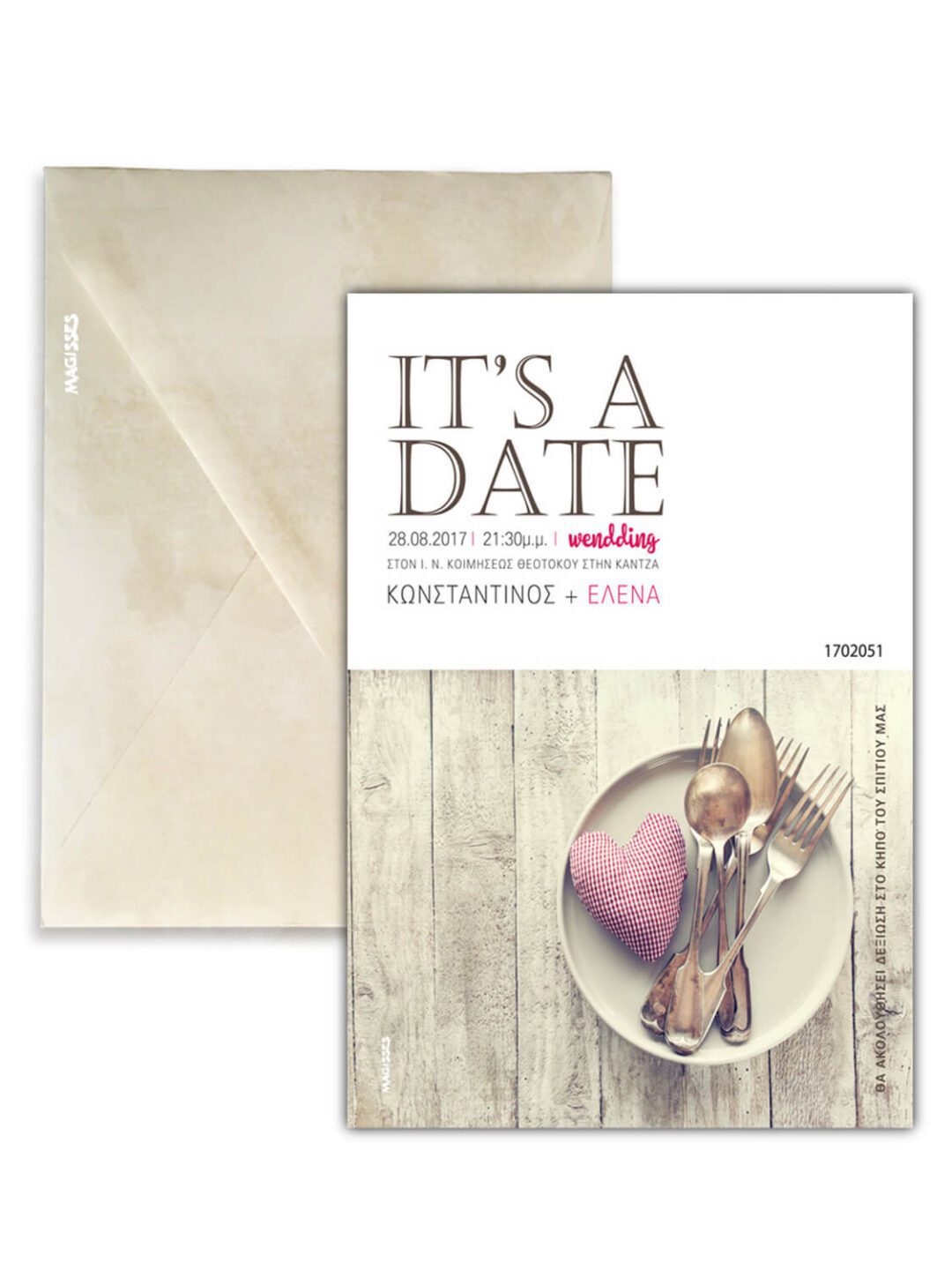 Προσκλητήριο γάμου κατακόρυφο από χαρτόνι σε μπεζ χρώμα με θέμα It’s a Date