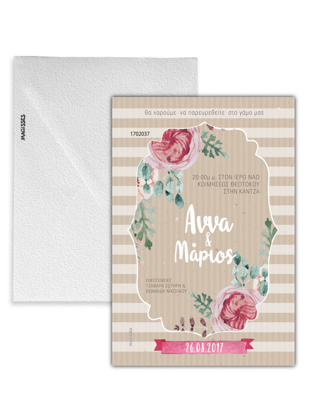Προσκλητήριο γάμου κατακόρυφο σε μπεζ/καφέ ριγιέ χρώμα με θέμα λουλούδια
