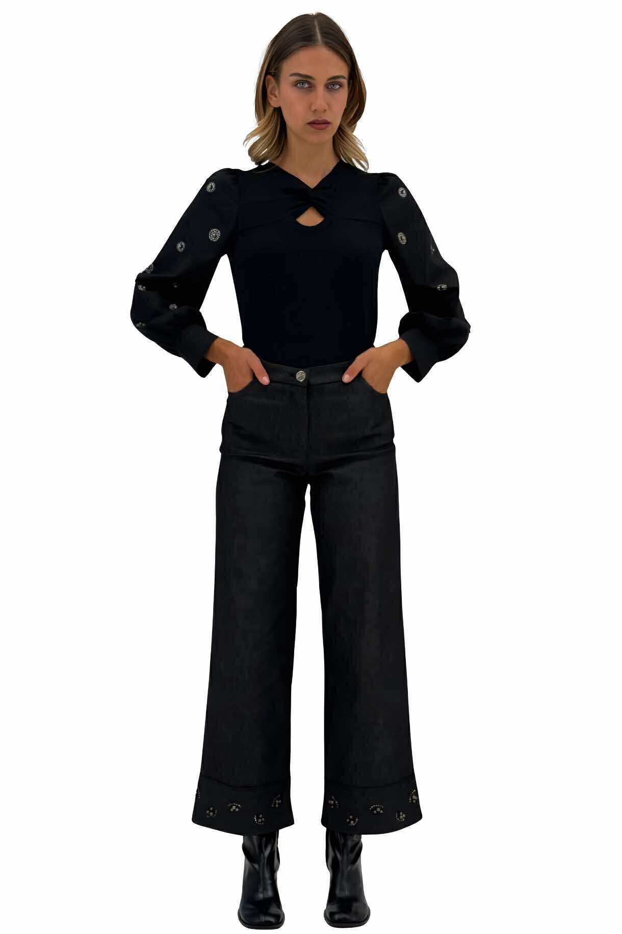 Μαύρο γυναικείο τζιν παντελόνι με κέντημα στο ρεβέρ