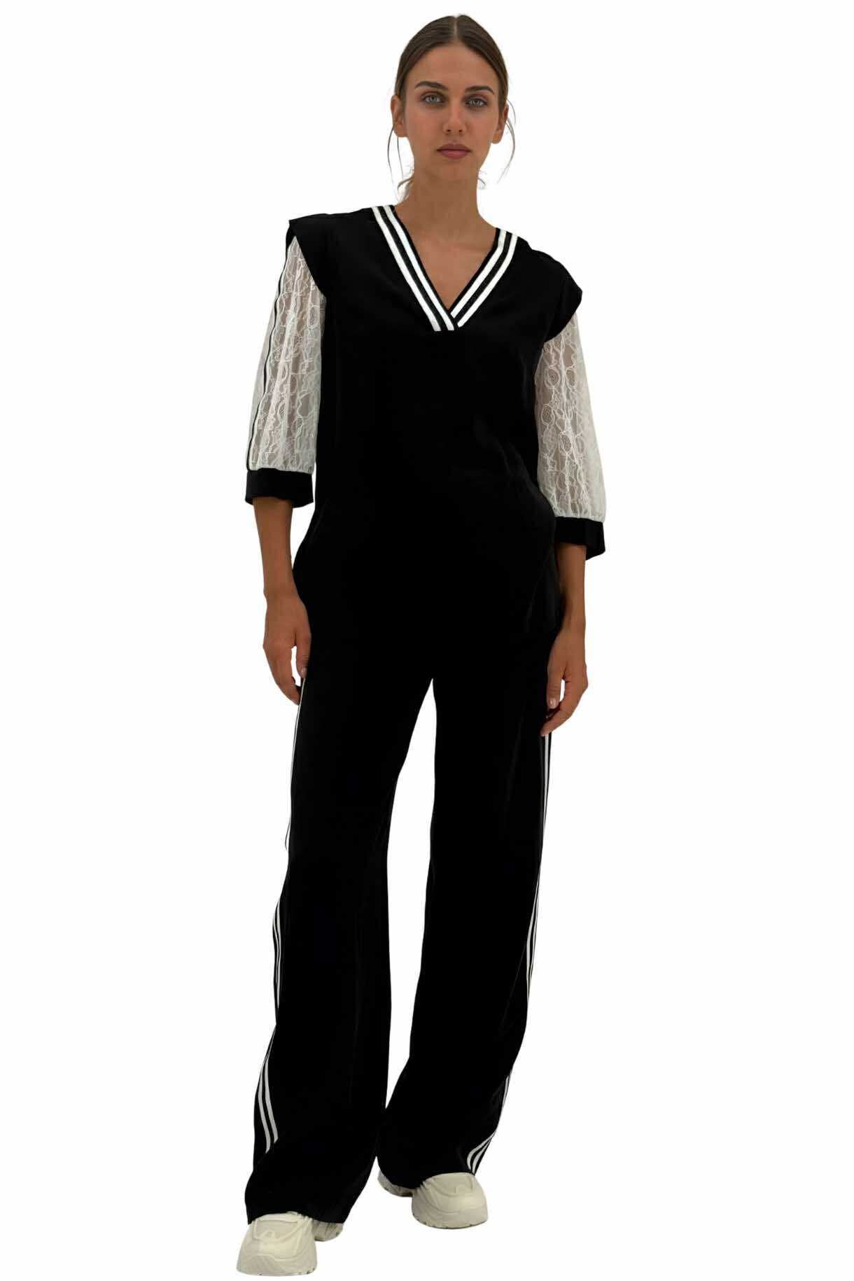 Μαύρη γυναικεία μπλούζα με λευκή δαντέλα στα μανίκια