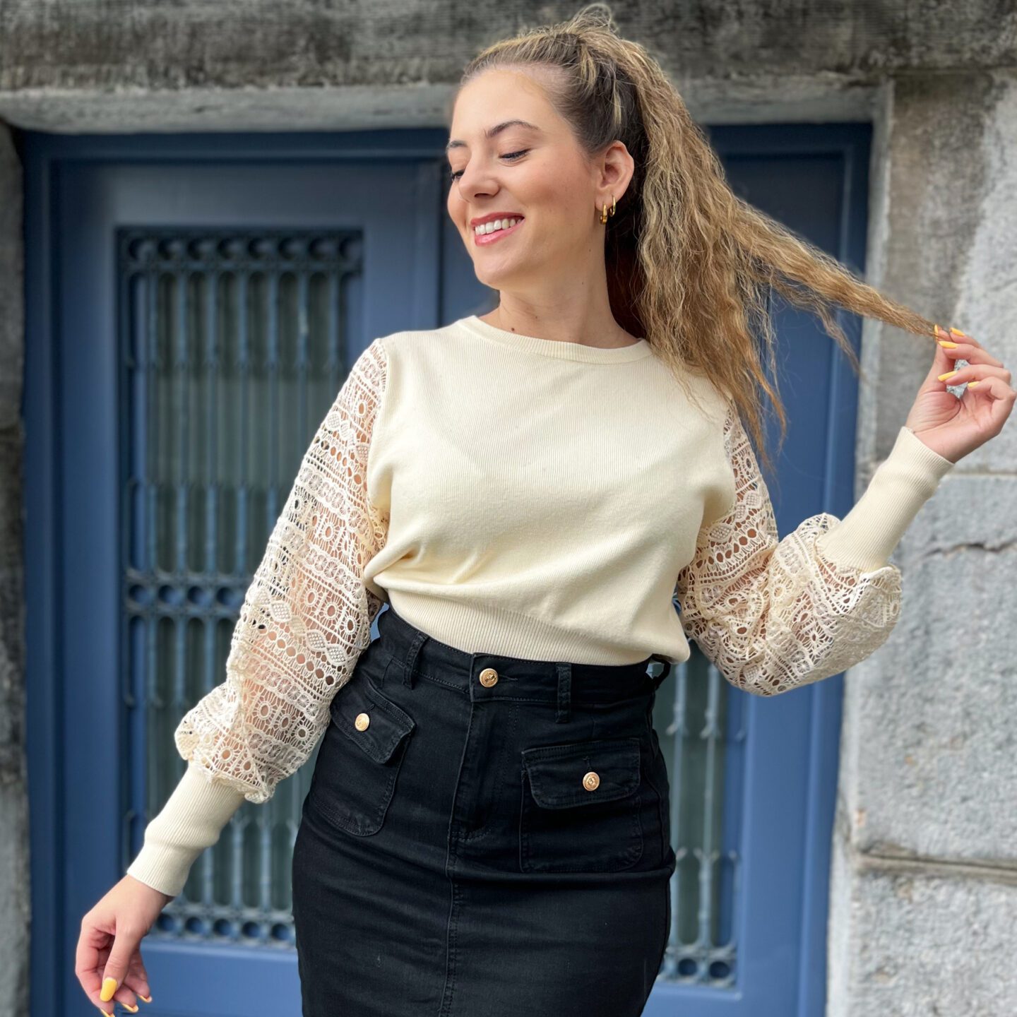 Πλεκτή μπλούζα με διάτρητα μανίκια σε εκρού