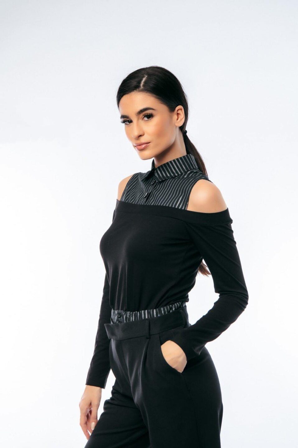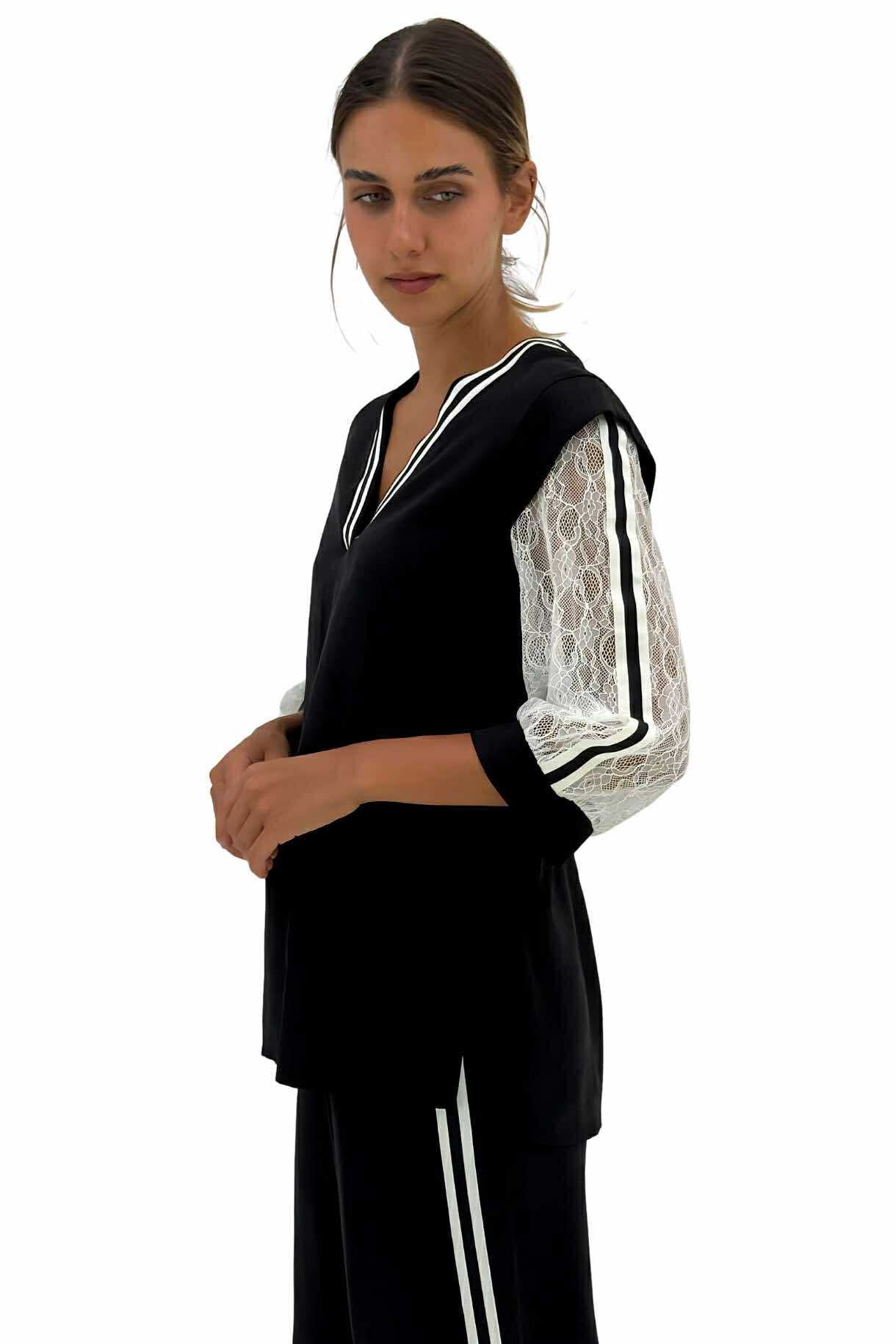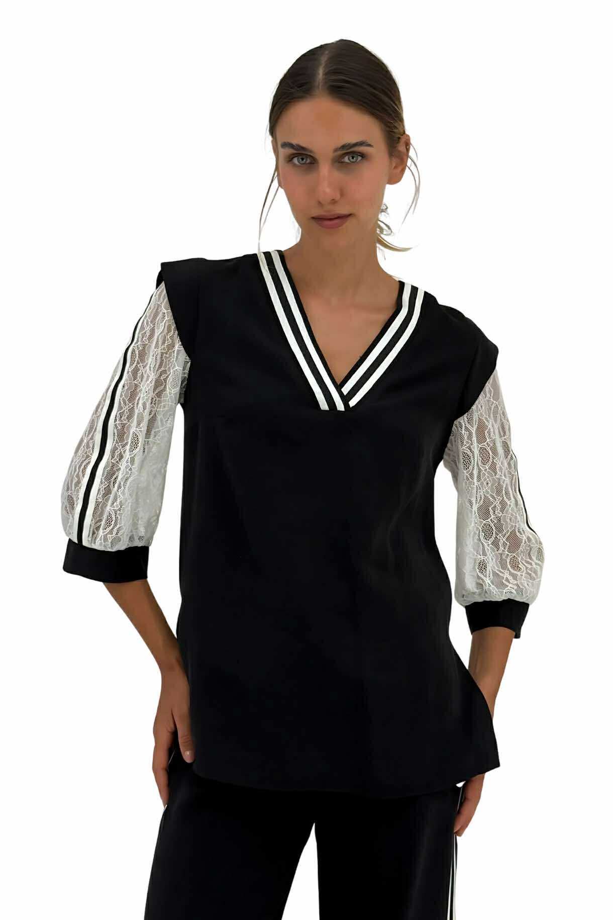 Μαύρη γυναικεία μπλούζα με λευκή δαντέλα στα μανίκια