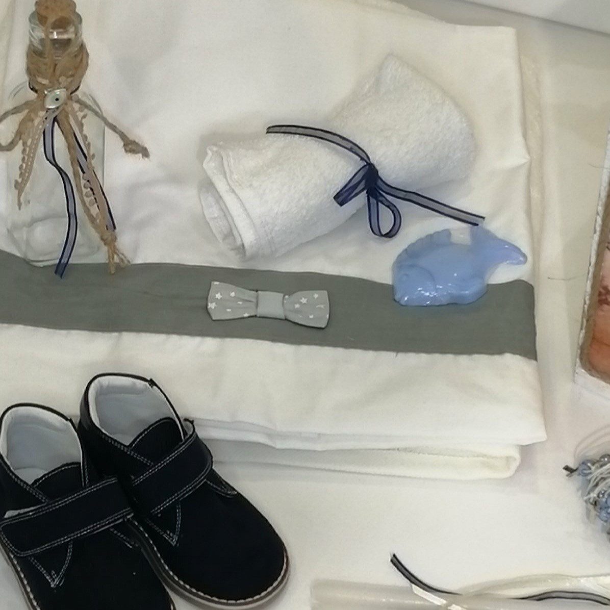 Πλήρες σετ βάπτισης με κουτί και θέμα το καράβι, συνδυασμένο με ρούχο και παπούτσι