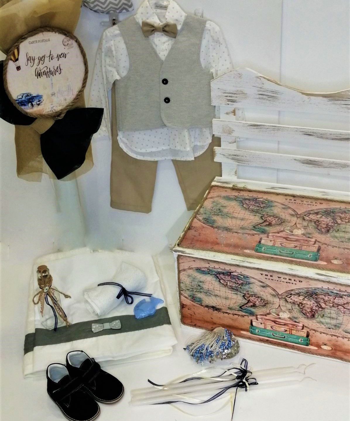 Σετ βάπτισης με παγκάκι και θέμα ταξίδια, συνδυασμένο με ρούχο και παπούτσι