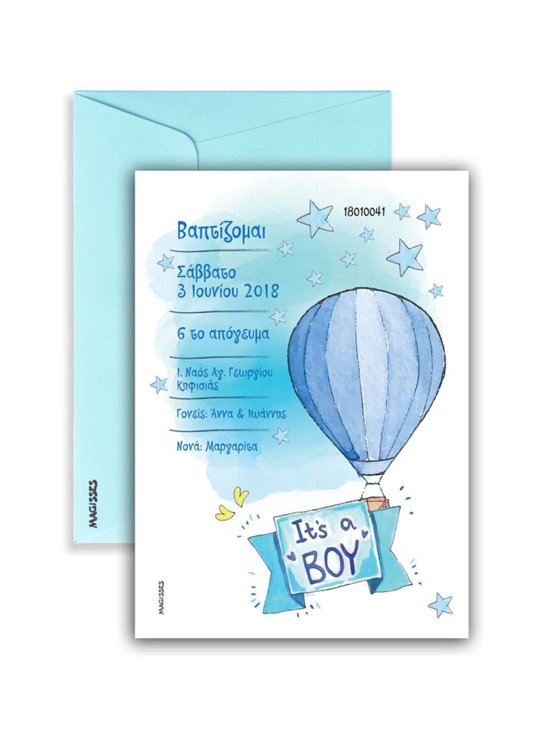 Προσκλητήριο Βάπτισης κατακόρυφο, από σαγρέ χαρτόνι με θέμα το αερόστατο και τα αστεράκια