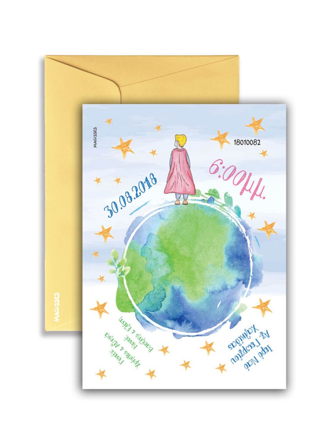 Προσκλητήριο Βάπτισης κατακόρυφο, από γυαλιστερό χαρτόνι με θέμα τον Μικρό Πρίγκιπα
