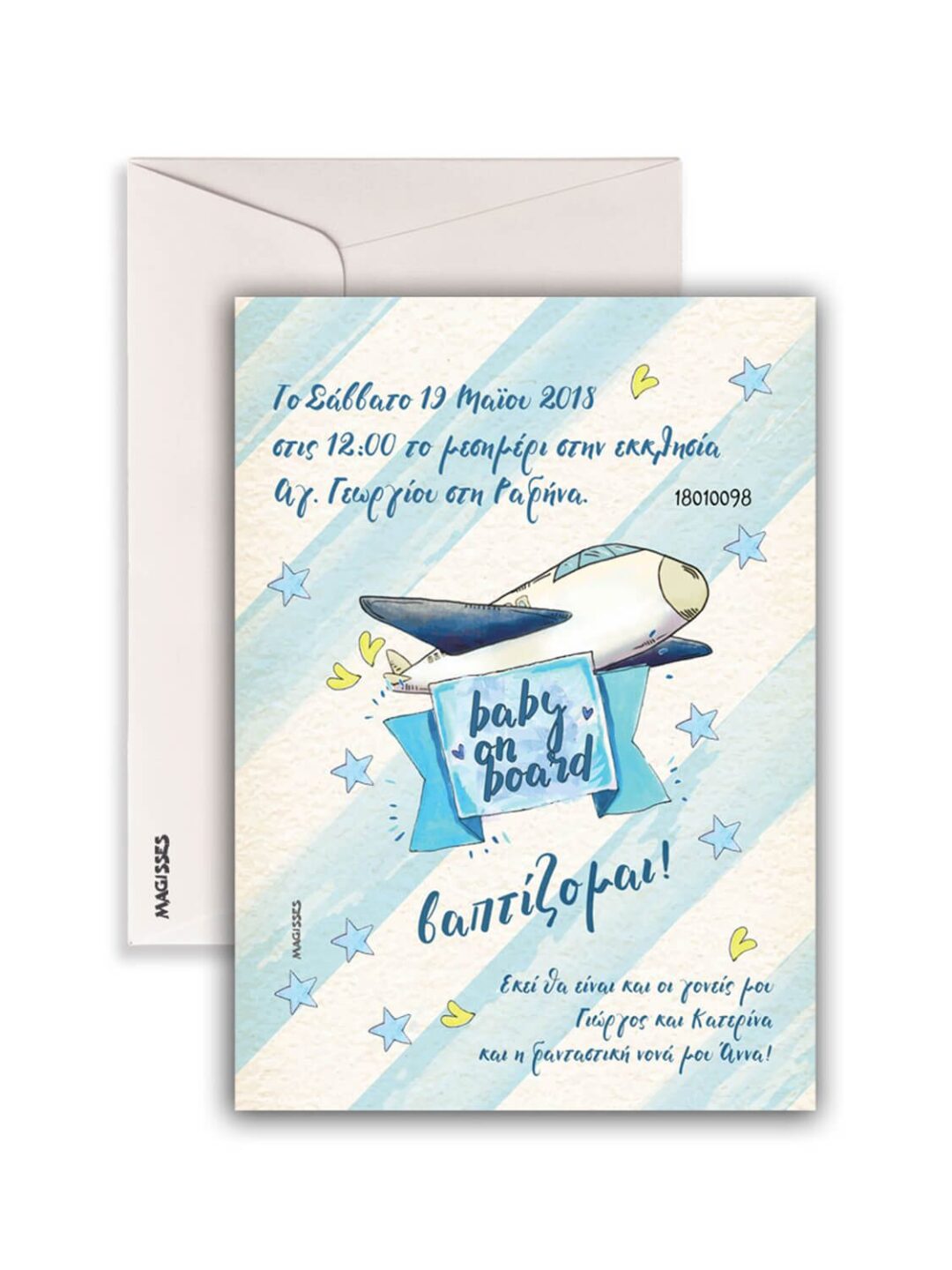 Προσκλητήριο Βάπτισης κατακόρυφο, από σαγρέ χαρτόνι, με θέμα το αεροπλάνο