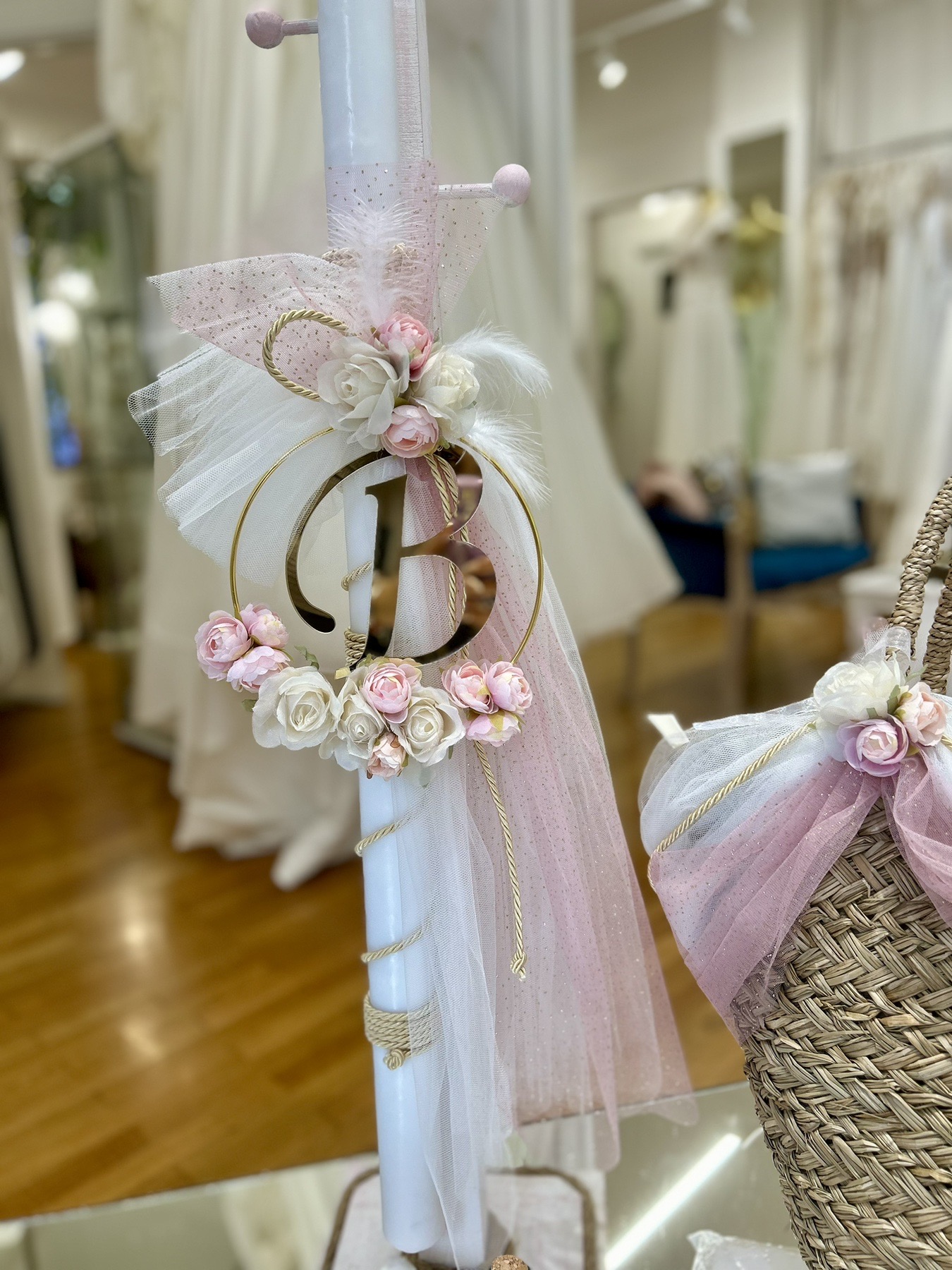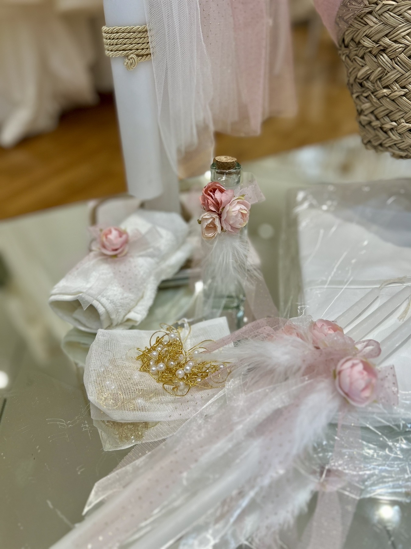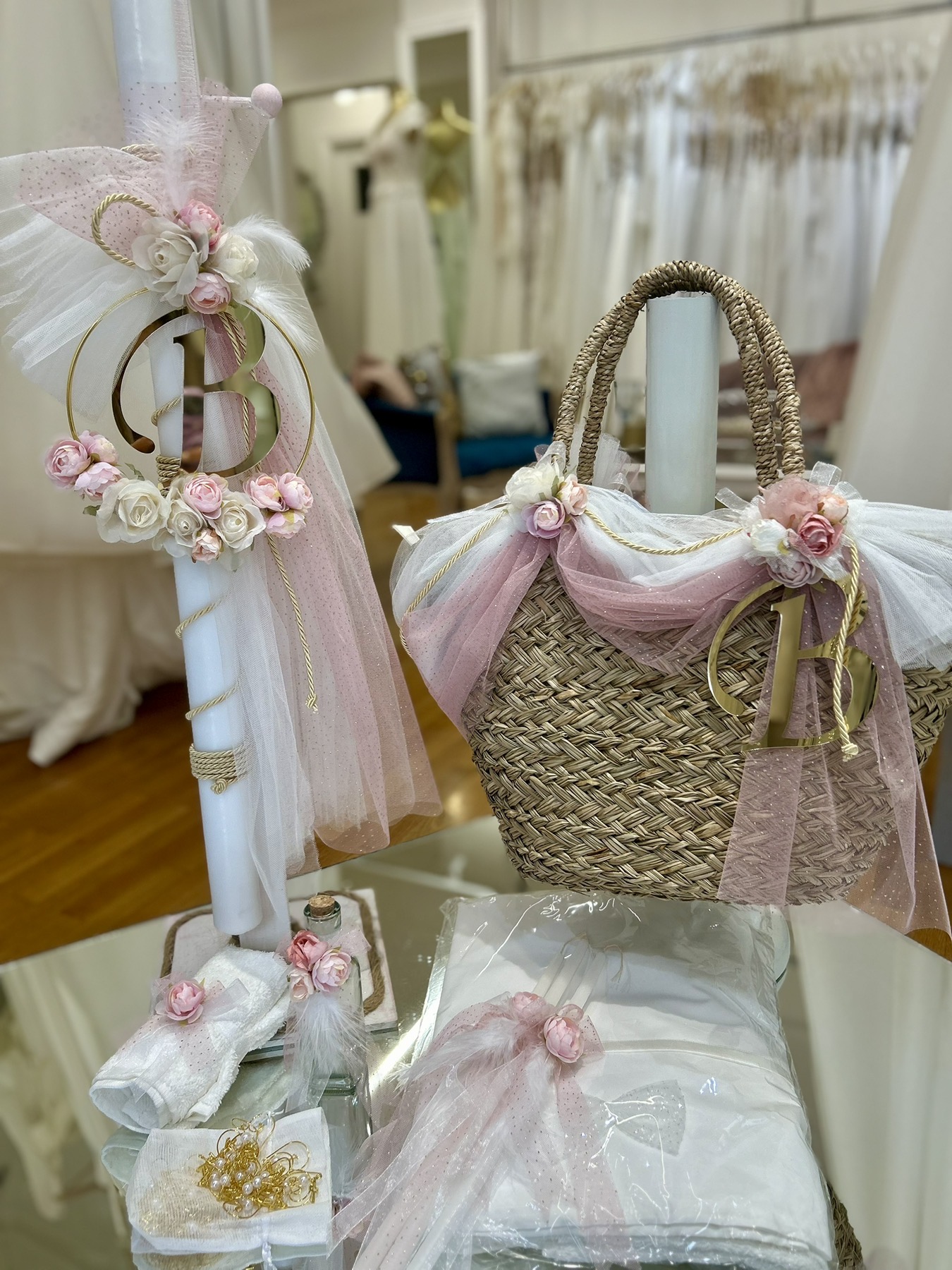 Ολοκληρωμένο πακέτο βάπτισης με ψάθινη τσάντα σε ρομαντικό στιλ