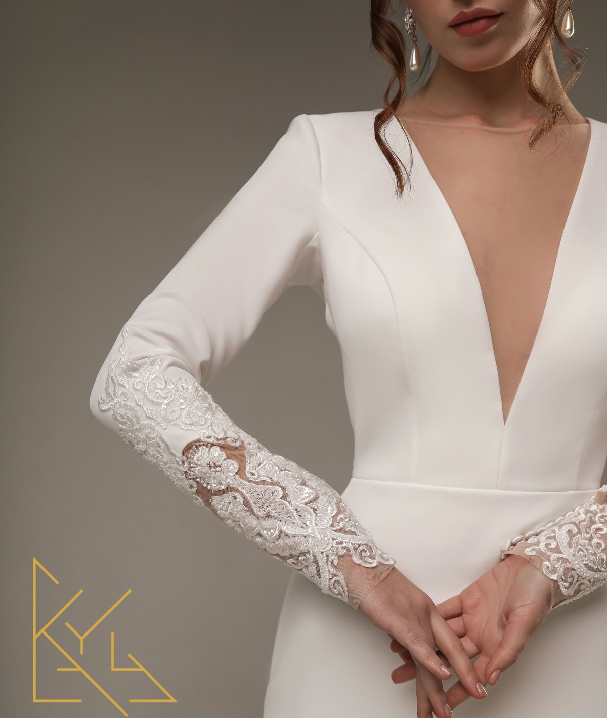 Αριστοκρατική φινέτσα & κομψότητα. Ένα νυφικό που συνδυάζει τη μίνιμαλ κομψότητα του κρεπ υφάσματος με την ρομαντική λεπτομέρεια της κεντημένης δαντέλας στο μανίκι. Η καθαρή γραμμή του αγκαλιάζει απαλά τη σιλουέτα, ενώ τα λεπτά, διακριτικά κεντήματα χαρίζουν έναν αέρα πολυτέλειας και διαχρονικότητας.