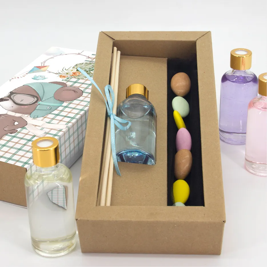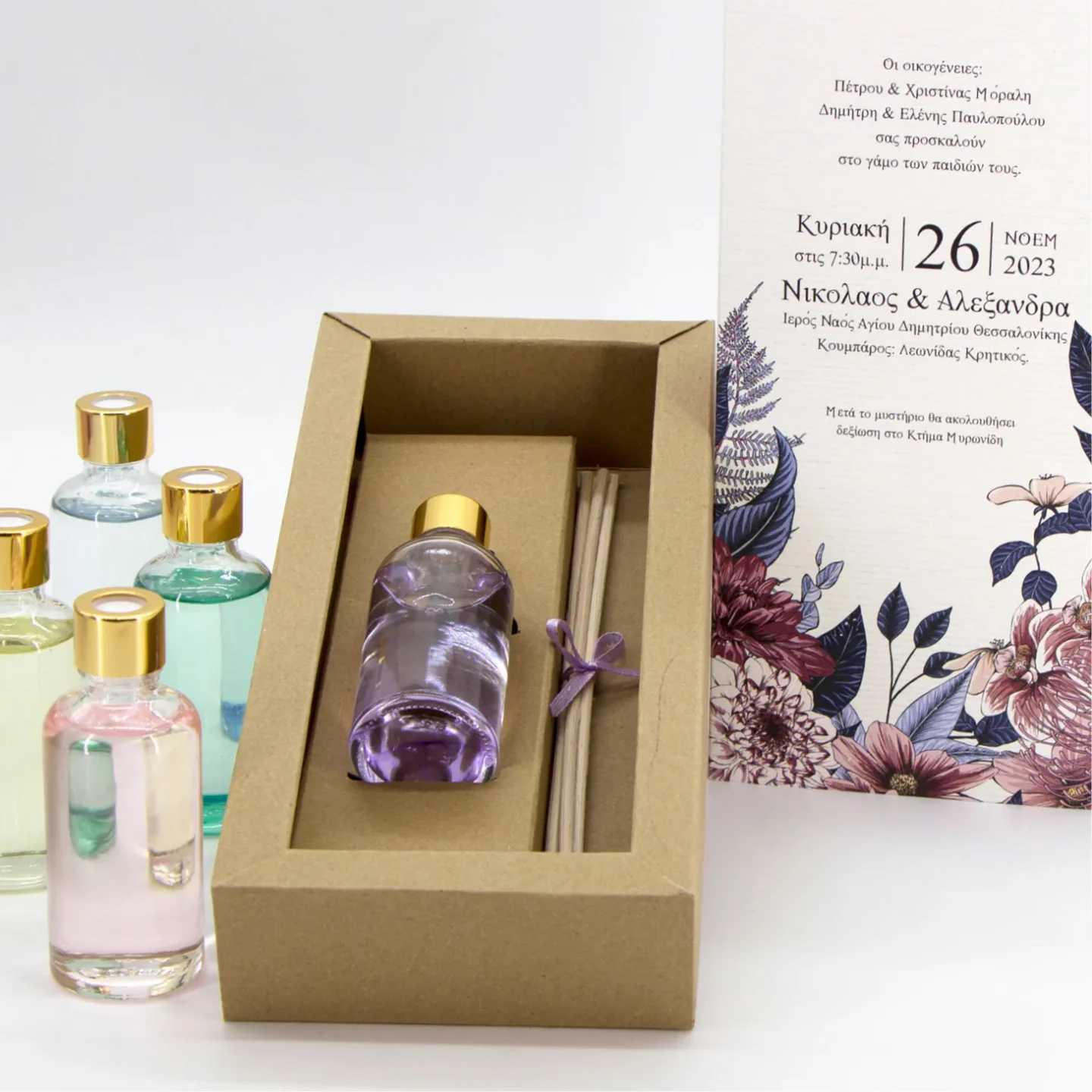 Αρωματικό χώρου 50ml σε γυάλινη φιάλη, με 4 sticks. Συνοδεύεται από συρταρωτό κουτί 4x11x24εκ από χαρτί craft 400gr και καπάκι τυπωμένο στο θέμα του μυστηρίου. Διατίθεται σε 6 χρώματα/αρώματα επιλογής.