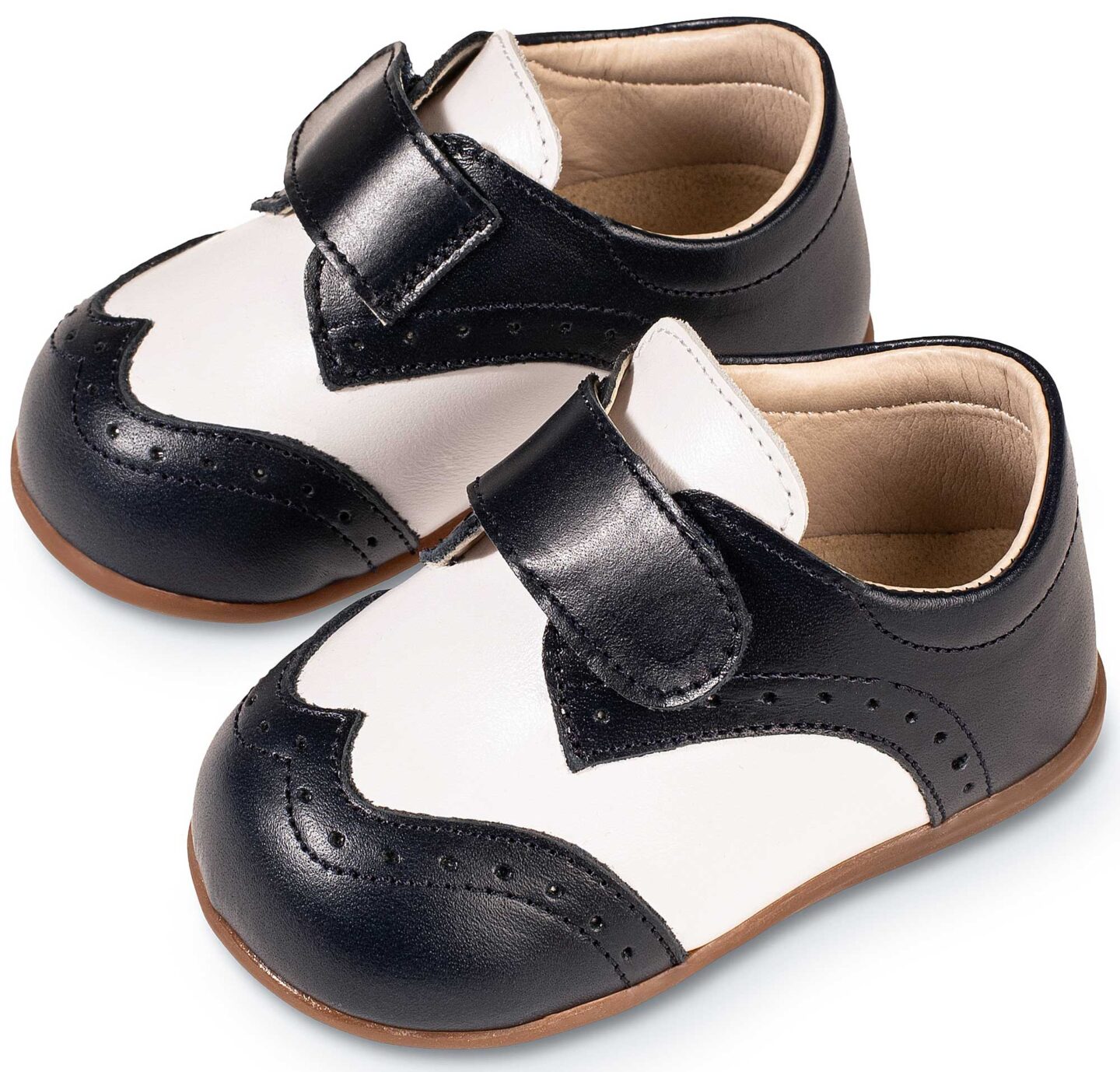 Βαπτιστικά παπούτσια δίχρωμα brogues για τα πρώτα βήματα με μονή μπαρέτα velcro από δέρμα νάπα & Gaucho σε λευκό μπλε χρώμα.