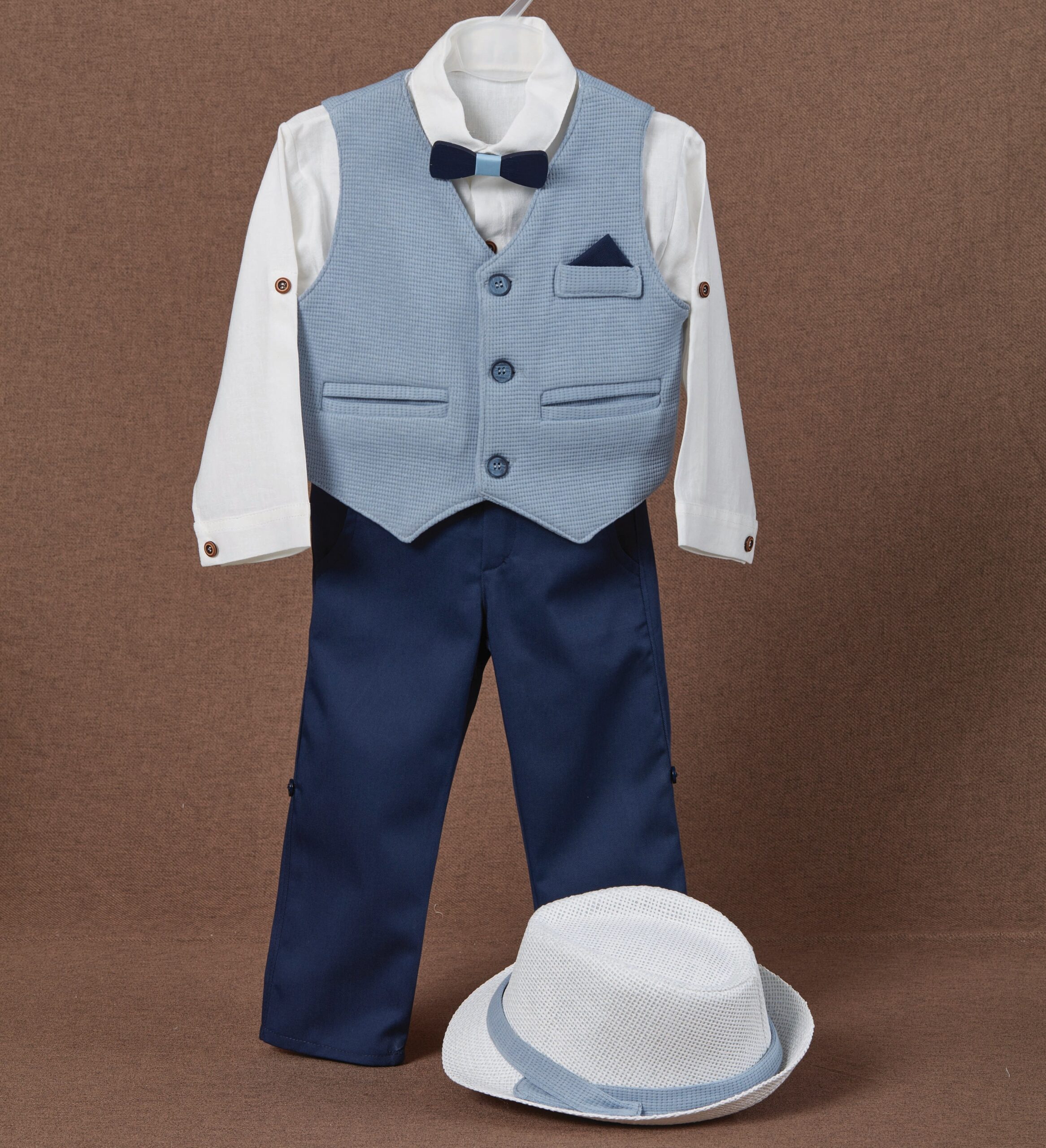 Βαπτιστικό κουστούμι σε μπλε – σιέλ αποχρώσεις. Διαθέτει σιέλ γιλέκο, λευκό πουκάμισο,  μπλε παντελόνι, παπιγιόν και δικό του καπελάκι και τιράντες.