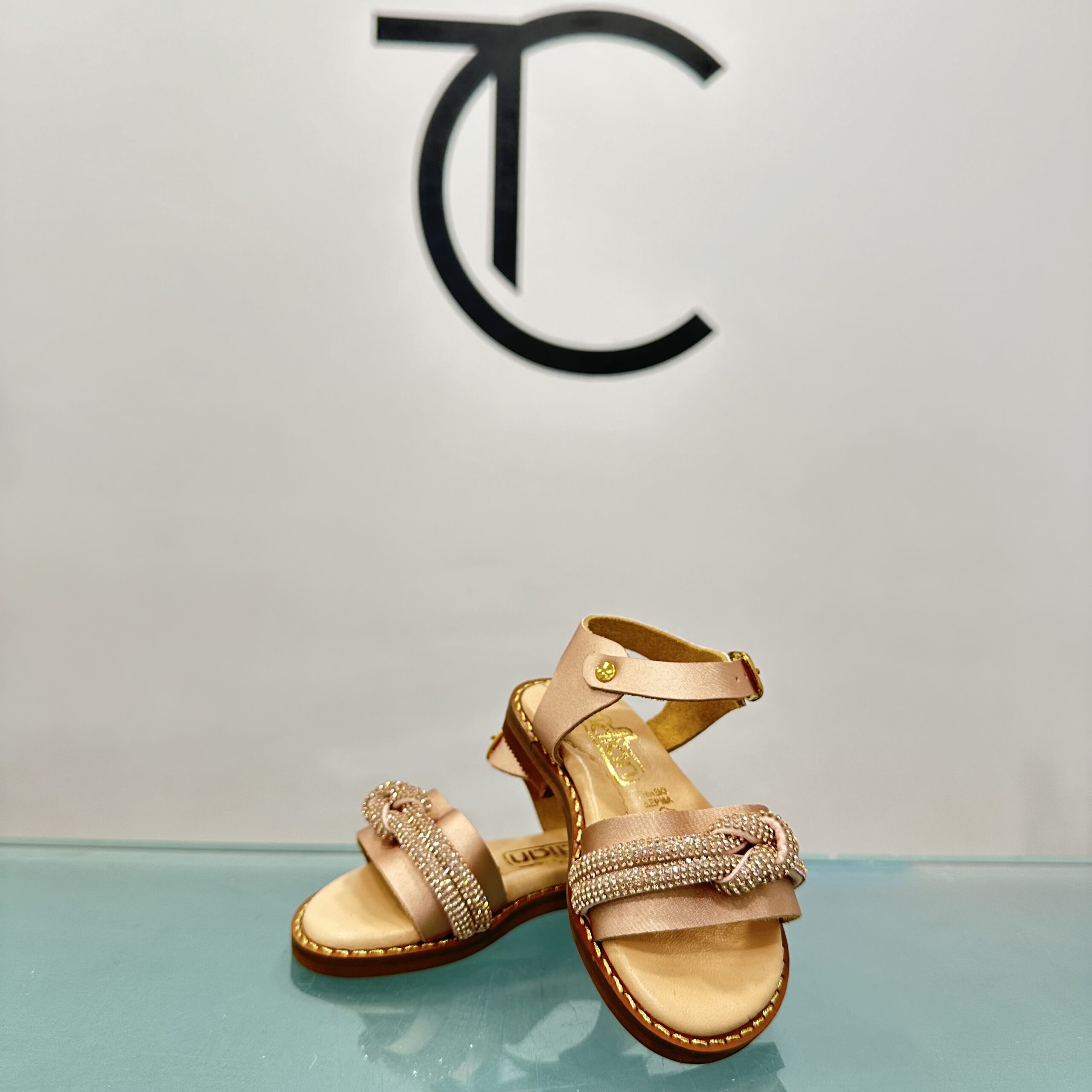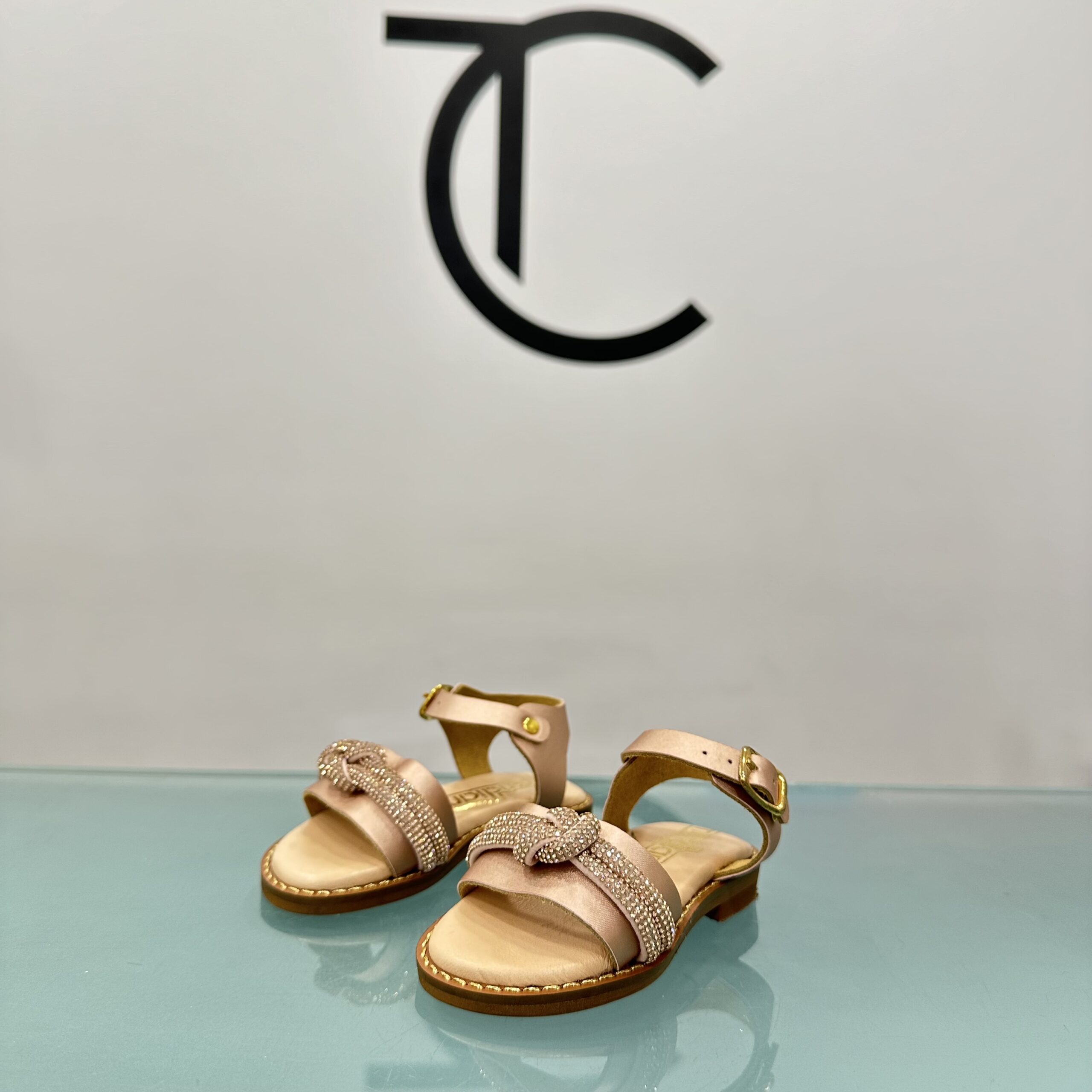 Βαπτιστικό παπούτσι πεδιλάκι σε ροζ χρυσό χρώμα και στρας. Με δερμάτινο ανατομικό πάτο για ξεκούραστο περπάτημα, κατάλληλο για τα πρώτα βήματα του παιδιού. Ελληνικής ραφής