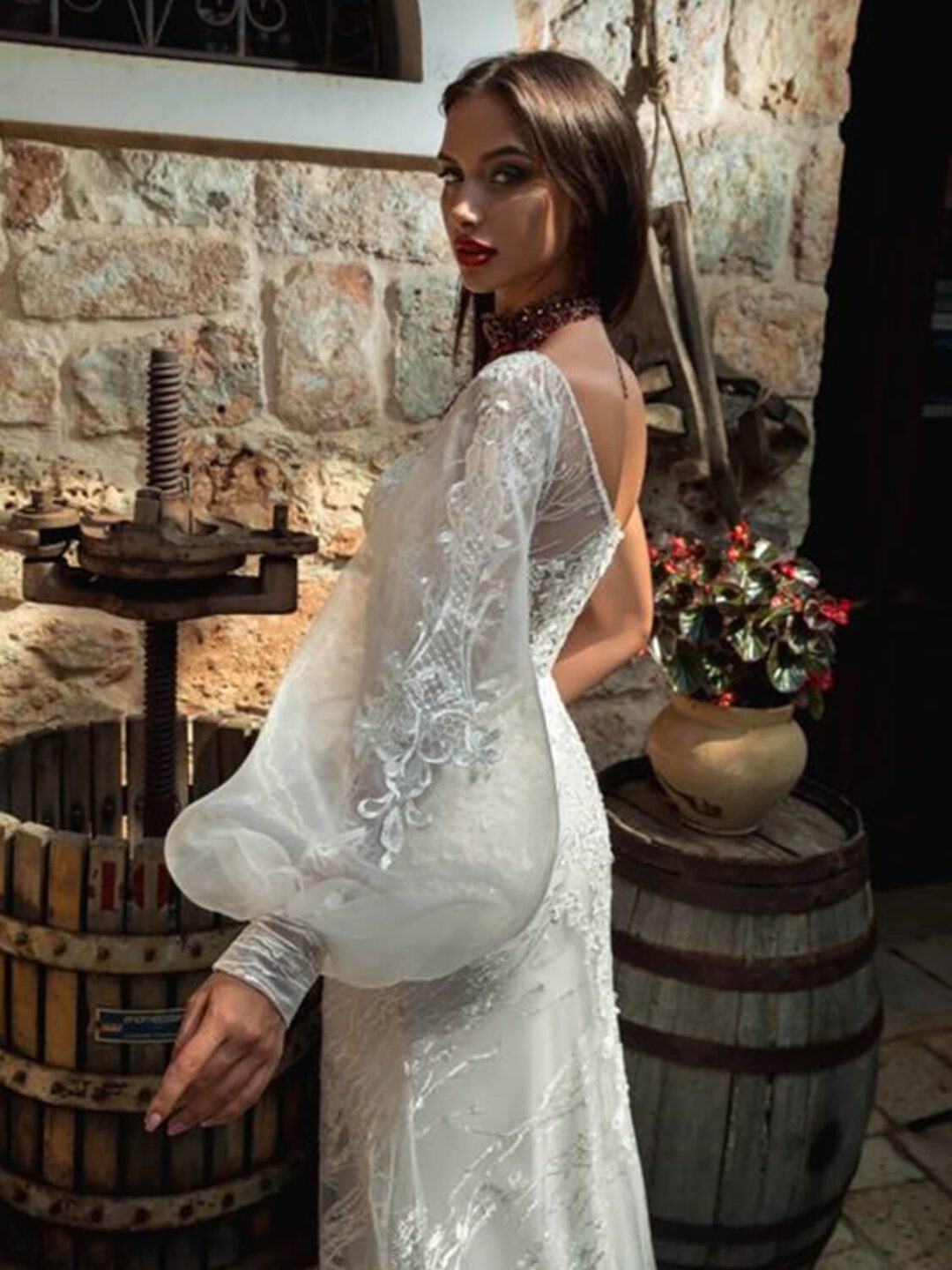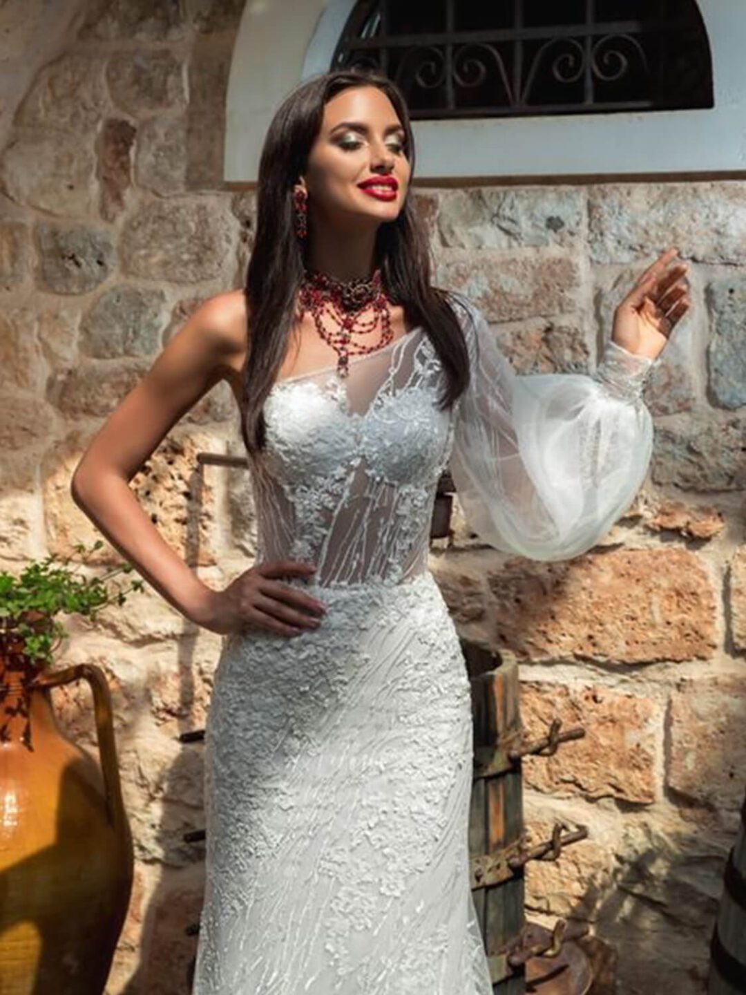 Γοργονέ νυφικό ολοκέντητο με γαλλική δαντέλα και διαφάνεια soleil στο μπούστο, με έναν ώμο και φουσκωτό μανίκι δαντέλα. Φούστα γοργόνας με μακριά ουρά.