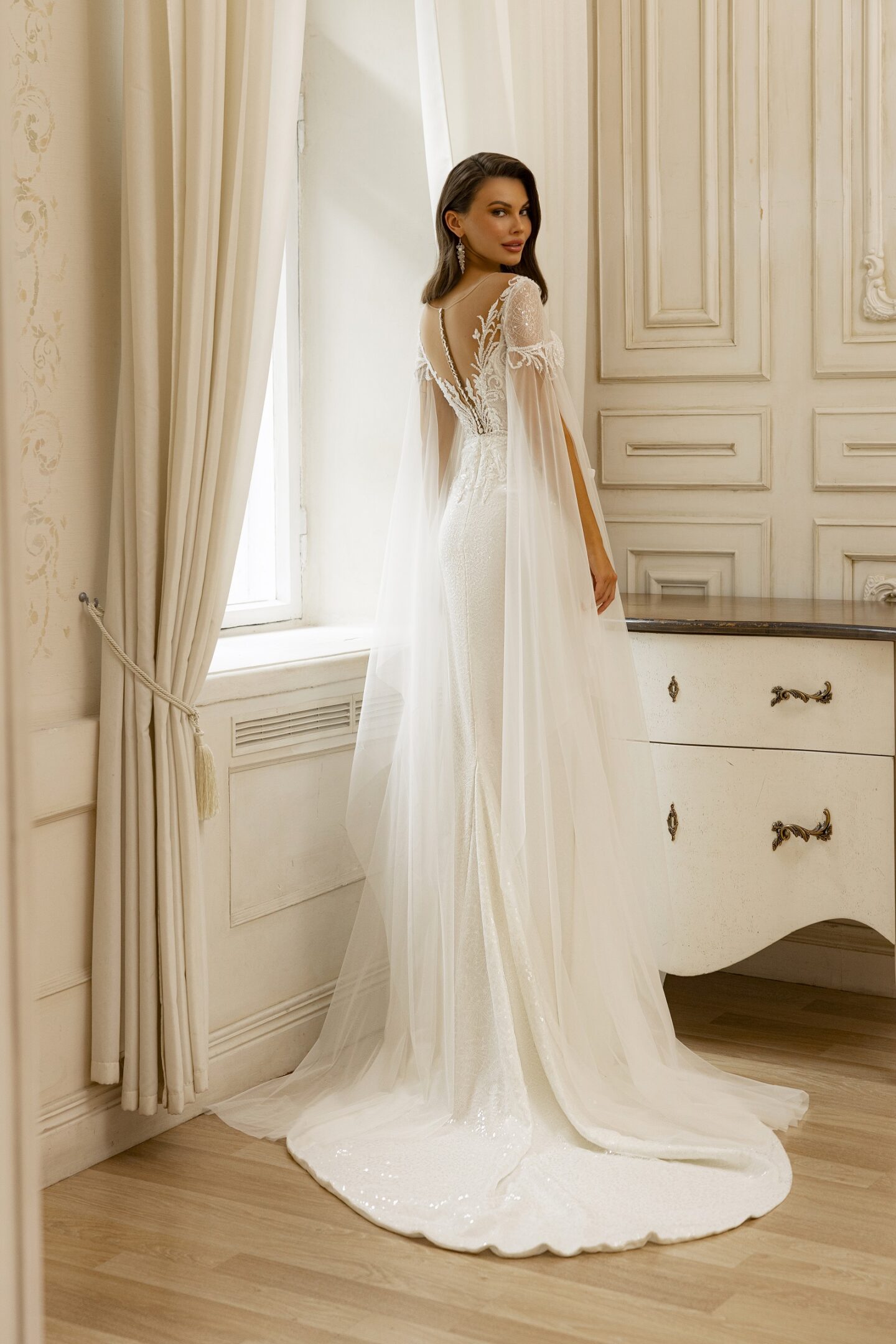 Γοργονέ νυφικό με εντυπωσιακά μανίκια. Διαθέτει μανίκια φτιαγμένα από διάφανο τούλι με υπέροχες λεπτομέρειες από δαντέλα,προσθέτοντας ρομαντισμό και παιχνιδιαρικη αίσθηση.