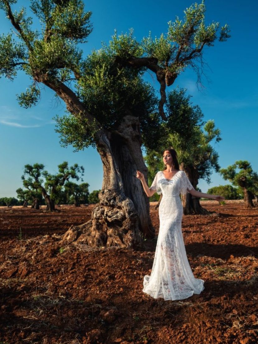 Γοργονέ Nυφικό από γαλλική δαντέλα με ανοιχτή πλάτη με βολάν περιμετρικά. Εντυπωσιακή ουρά, μπούστο V και μανίκι δαντέλα. Κανονική εφαρμογή.