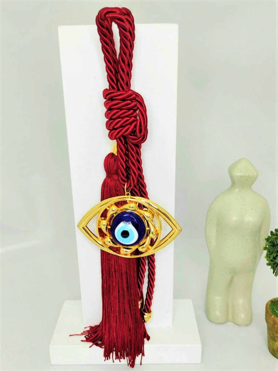 Γούρι 2022 με μεγάλο μάτι, διακοσμητικά στοιχεία επιχρυσωμένα με 24 καράτια , με σατέν κορδόνι και μεταξωτή φούντα. Μήκος 33 εκ. Ένα πολυτελές γούρι, ιδανικό δώρο για το σπίτι ή το γραφείο