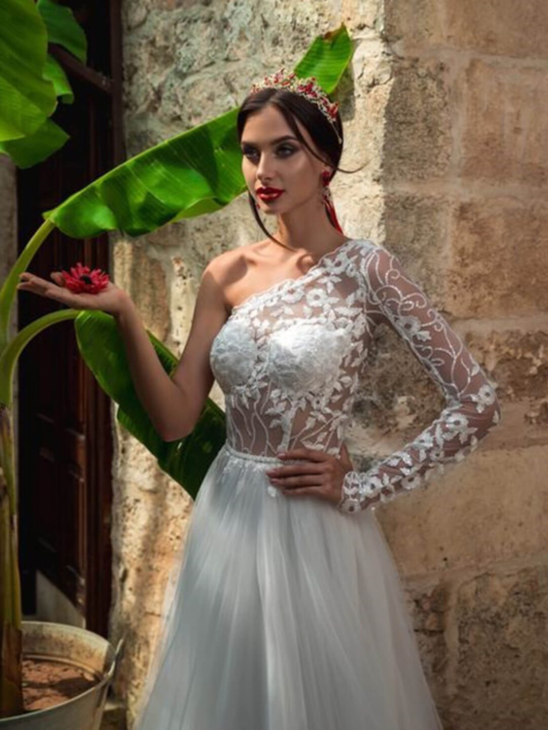 Εκκεντρικό νυφικό με ολοκέντητο μπούστο με γαλλική δαντέλα διαφάνεια soleil, με έναν ώμο και στενό μανίκι δαντέλα. Πλούσια φούστα από γαλλικό τούλι.