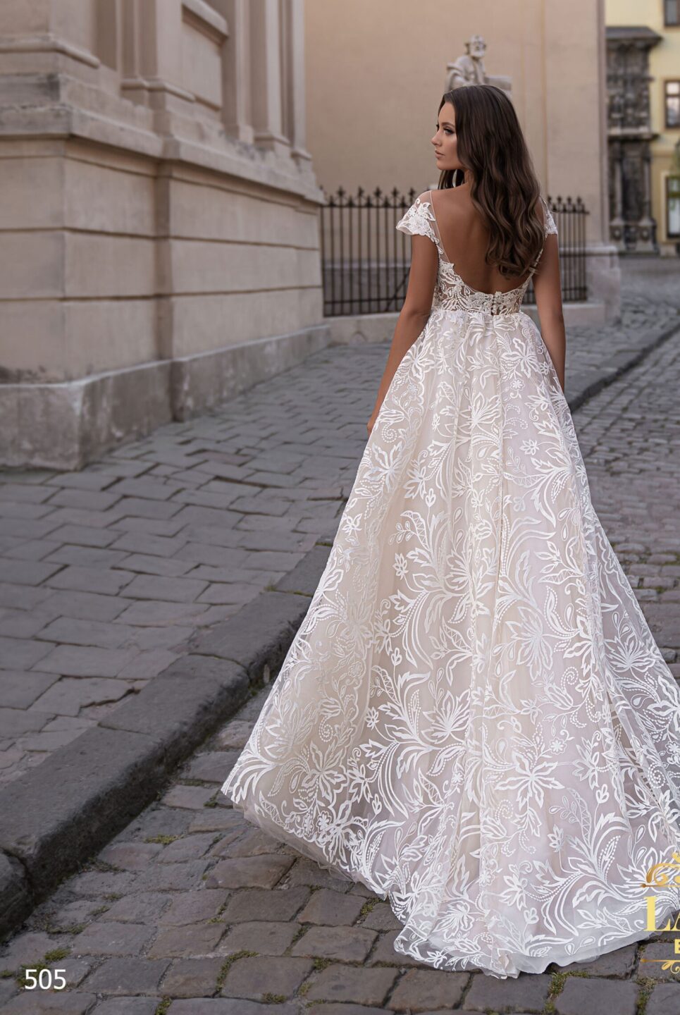 Εντυπωσιακό νυφικό με κεντητά σχέδια. Το νυφικό διαθέτει εντυπωσιακό μπούστο με κεντητά σχέδια και διαφλανεια.Στην πλάτη έχει χαμηλό άνοιγμα. Ιδανικό για πολιτικό και θρησκευτικό γάμο. Κανονική εφαρμογή