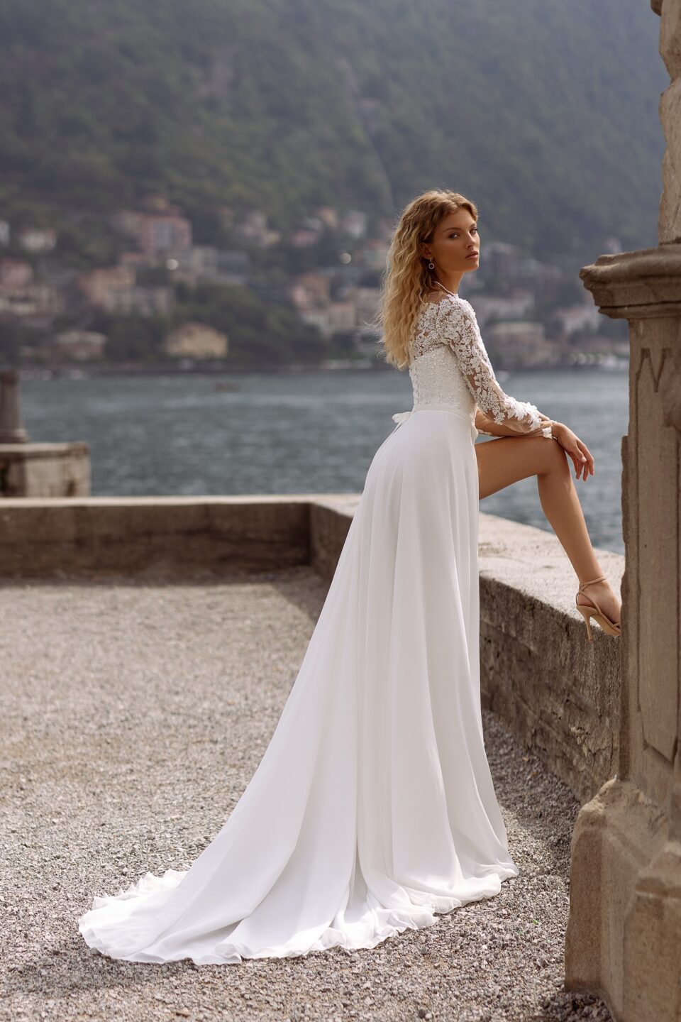 Εντυπωσιακό νυφικό με μανίκι και σκίσιμο. Βαθύ μπούστο V με διαφάνεια και μακρύ μανίκι. Διαθέτει ουρά