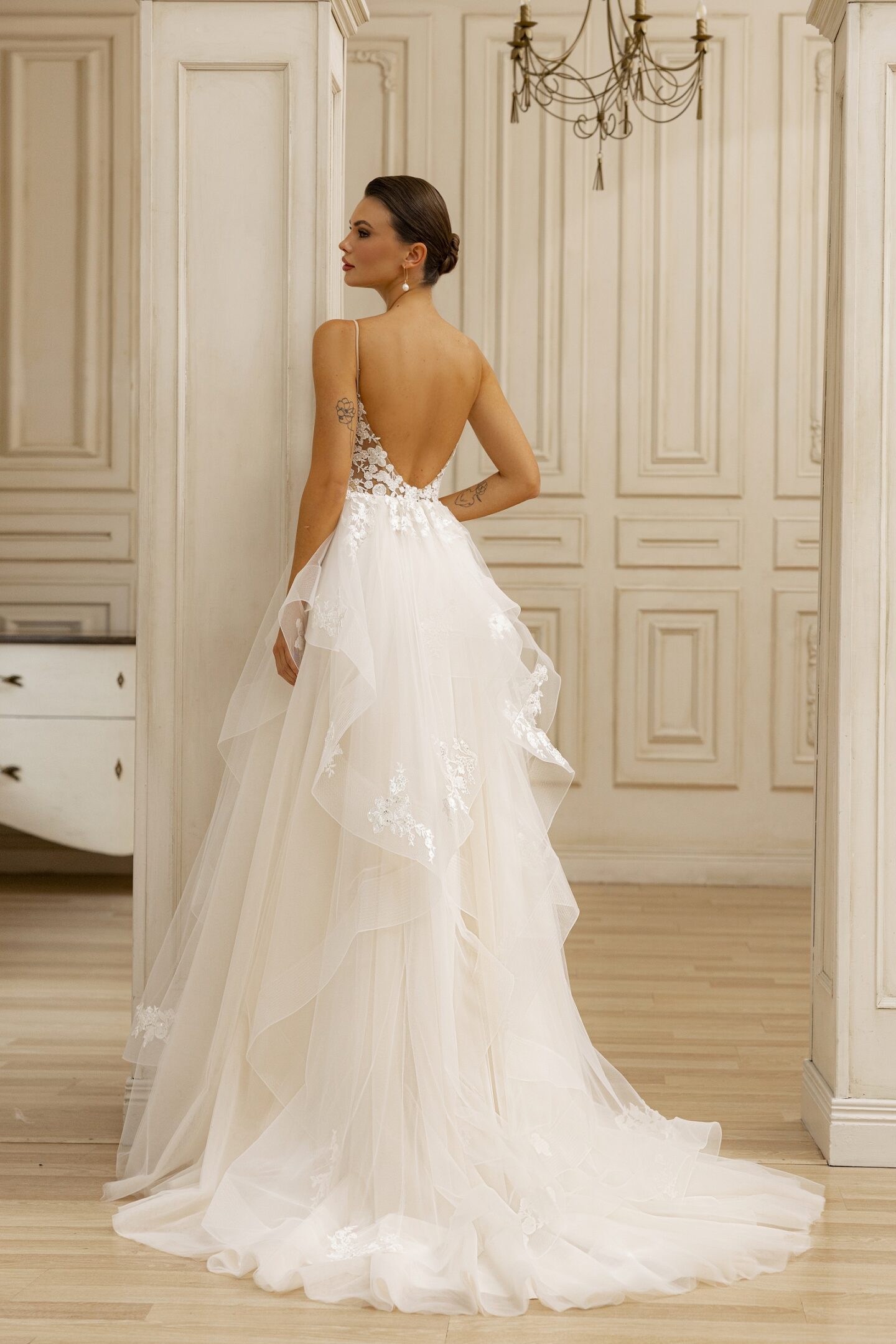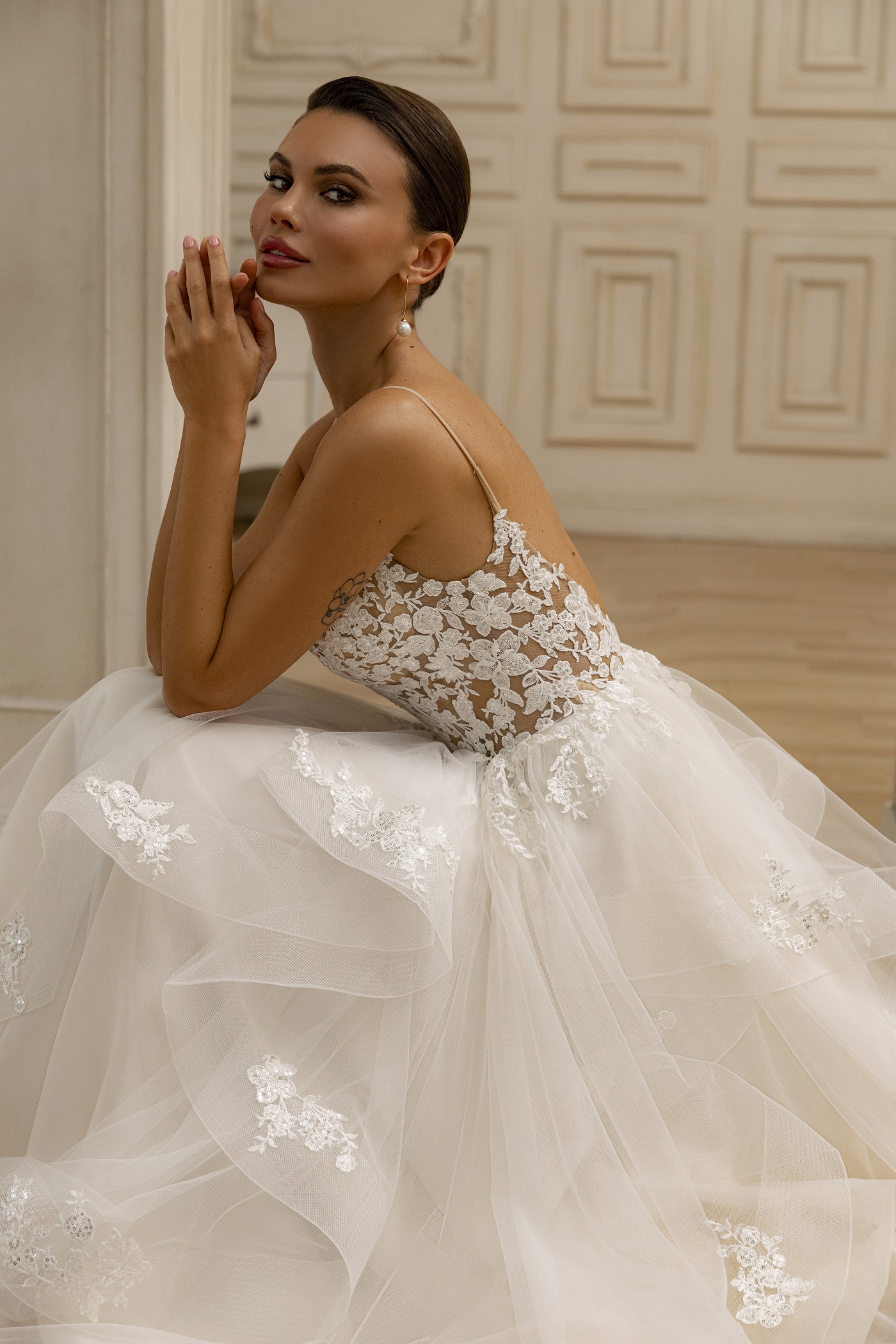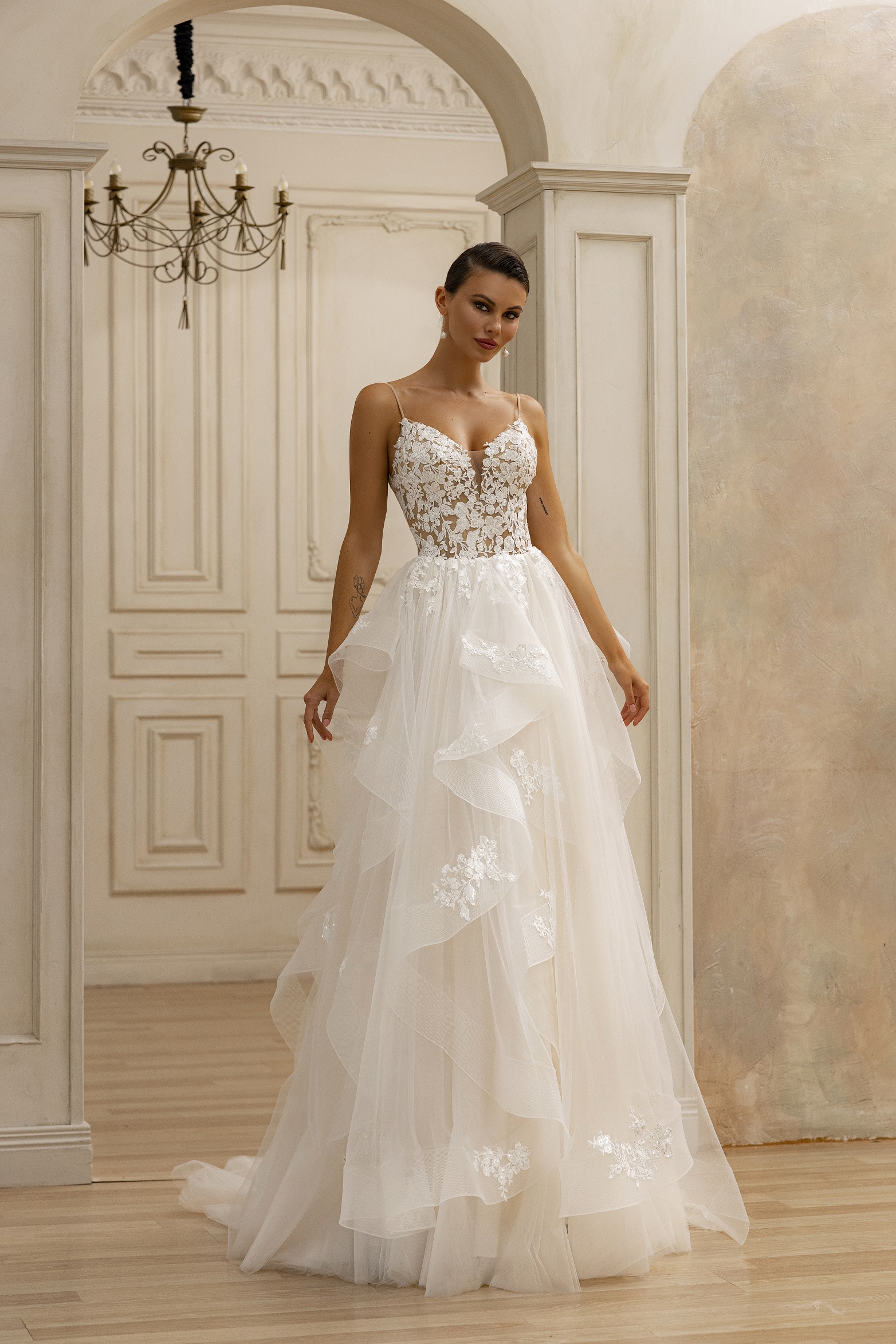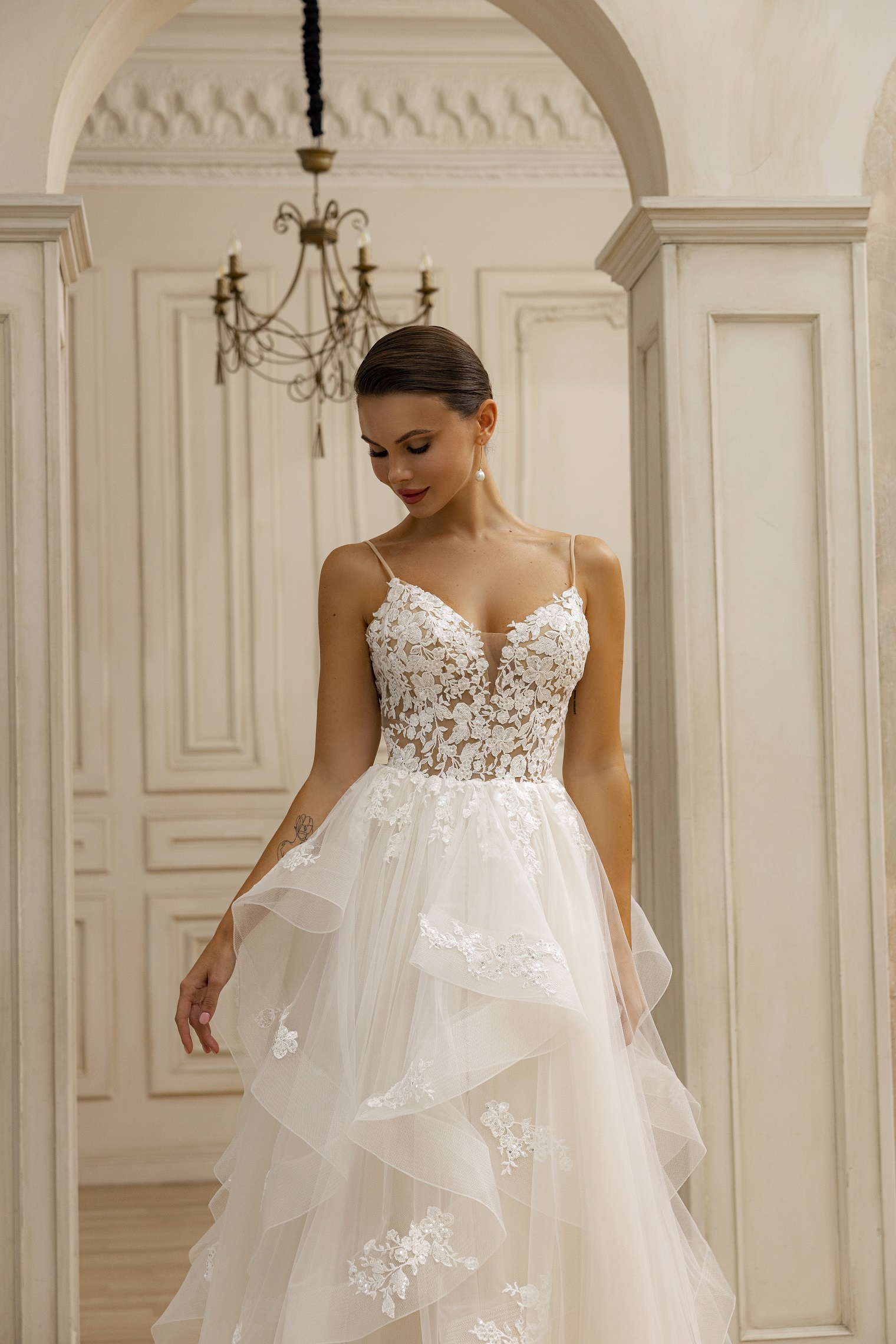 Εντυπωσιακό νυφικό με floral λεπτομέρειες. Διαθέτει τούλινη φούστα και δαντελένιο μπούστο που αναδεικνύει τη μέση σας.