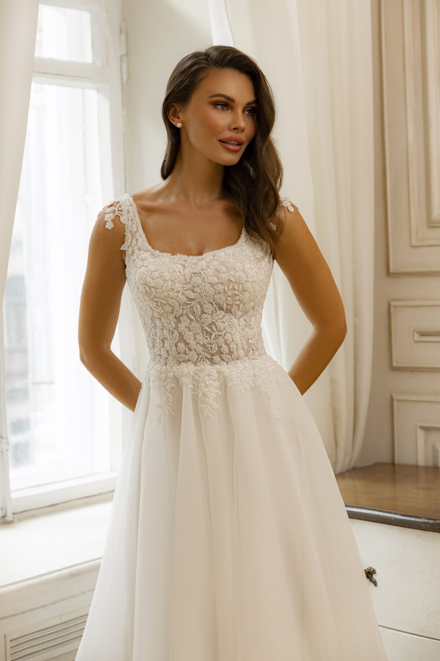 Κομψό νυφικο σε Α γραμμή. Το μπούστο είναι διακοσμημένο με δαντέλα και χάντρες για μια πινελιά λάμψης και κομψότητας.