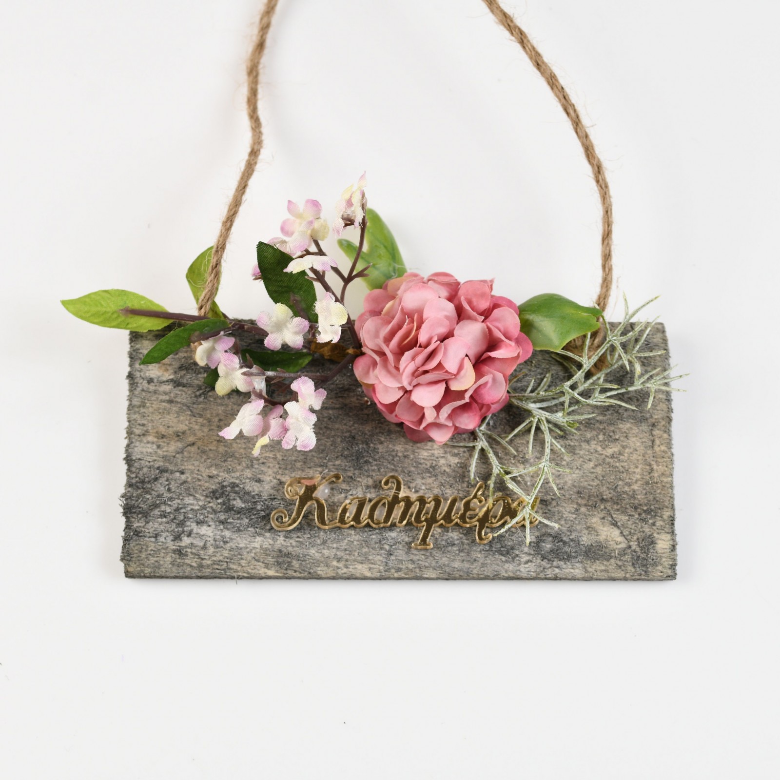 Κρεμαστό ξύλινο καδράκι με λουλούδια και plexiglass καλημέρα. Διαστάσεις: 15Χ20CM.