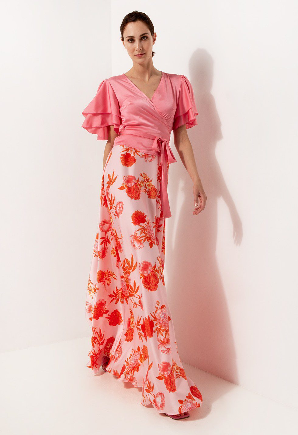 Κρουαζέ τοπ, σατεν υφή, βολάν στα μανίκια, δέσιμο στην μέση, κανονική εφαρμογή. Το μοντέλο φοράει νούμερο S, Στήθος: 90 Μέση: 74 Μάκρος 0,50m