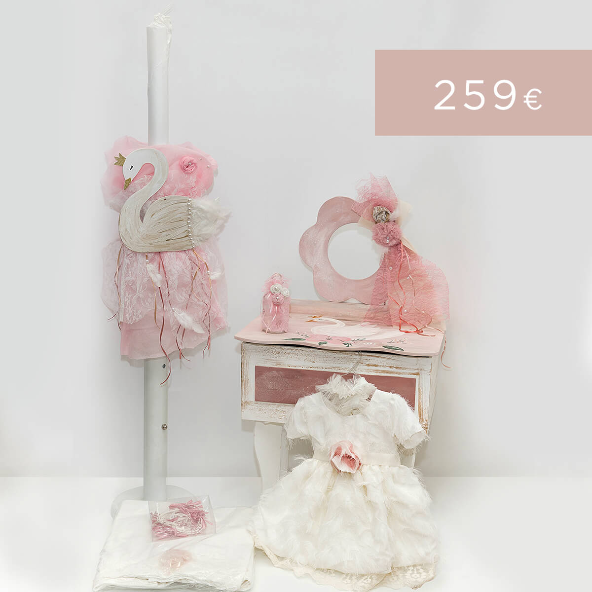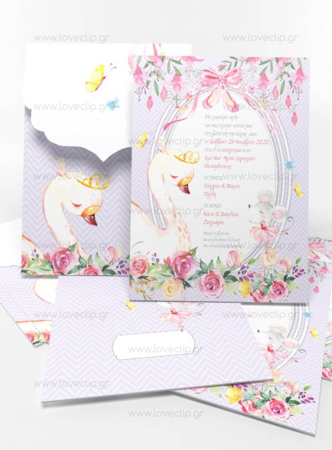 Επίλεξε θέμα βάπτισης το κλασσικό μπαλέτο “η λίμνη των κύκνων”, με τον κύκνο σε ρομαντικό floral περιβάλλον. Διάλεξε το μοτίβο, το είδος προσκλητηρίου εδώ, την μπομπονιέρα εδώ και το πλήρες σετ βάπτισης εδώ, βάλτα στο καλάθι αγορών σου μαζί με αυτό το θέμα και εμείς θα εφαρμόσουμε το θέμα παντού! Το εικαστικό μπορεί να εφαρμοστεί ως προσκλητήριο στα παρακάτω προϊόντα: Μονόκαρτο με exlusive προσωποποιημένο φάκελο (κάρτα: 14,5Χ20εκ – φάκελος: 15Χ21εκ), Παζλ 12 τμχ με εκτυπωμένο κουτί (puzzle: 12Χ17εκ – box: 12Χ12X4εκ), Ξύλινο καδράκι με κάλεσμα σε ρολάκι (τετράγωνο: 12,5×12,5εκ – στρογγυλό: Φ12εκ)