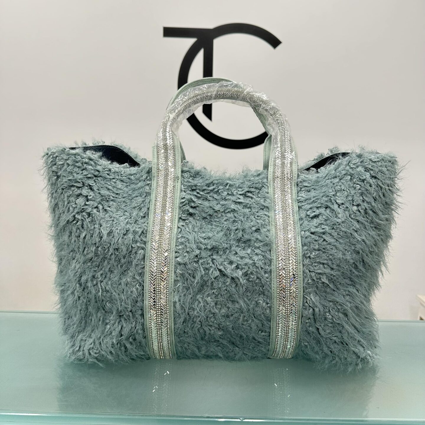 Μάλλινη τσάντα με στρας. Διαθέτει χερούλια με στράς που διακοσμούν την τσάντα και κλείνει από πάνω με φερμουάρ