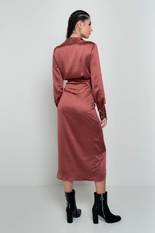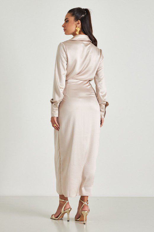 Μακρύ φόρεμα δετό. Έχει κανονική εφαρμογή και είναι σατινέ. Διαθέτει άνοιγμα στη δεξιά πλευρά και δέσιμο στη μέση