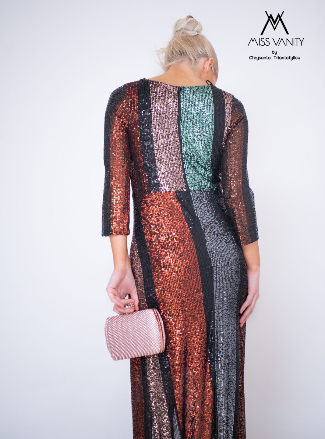 Μακρύ φόρεμα με παγιέτες σε 3 χρώματα, μαύρο ασημί και μπρονζέ σε ρίγες. Μπούστο κρουαζέ, μακρύ μανίκι και σκίσιμο μπροστά. Ένα εντυπωσιακό φόρεμα!