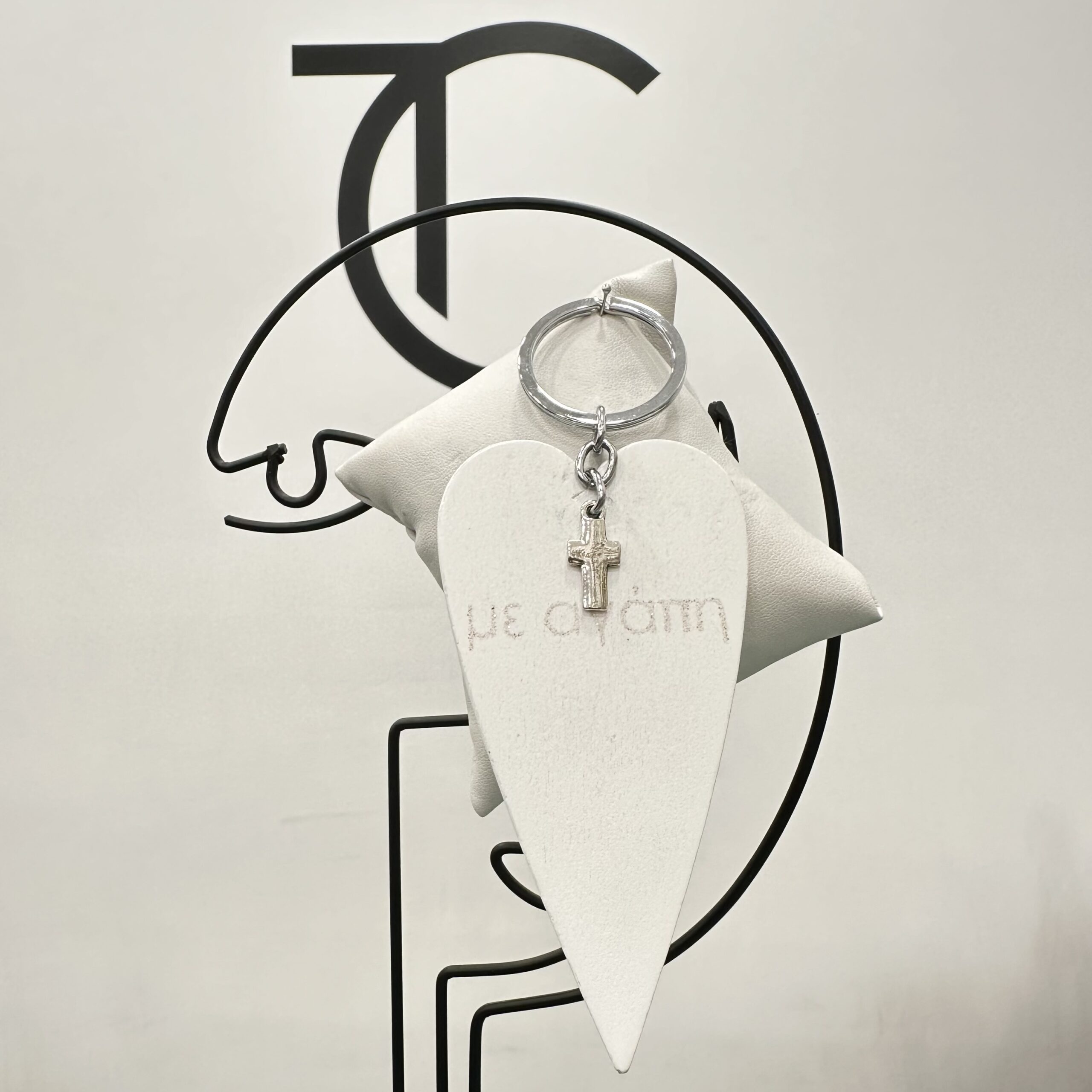 Μαρτυρικά για βάπτιση μπρελόκ με ξύλινη καρδιά σε λευκό χρώμα και ασημή σταυρό. Το κουτί περιλαμβάνει 50 τεμάχια.