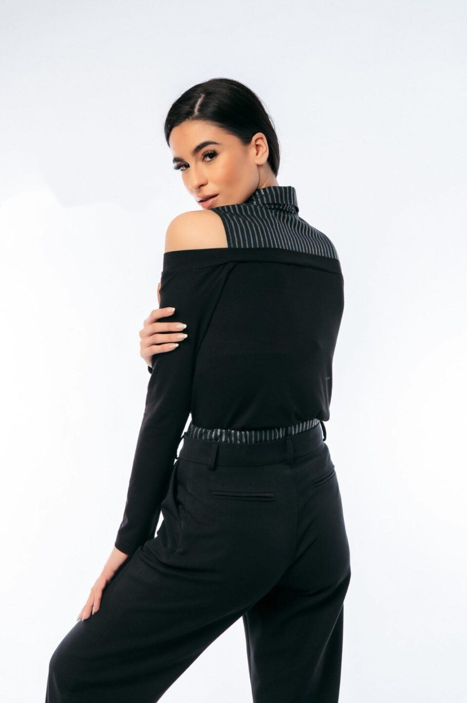 Μπλούζα με ενσωματωμένο αμάνικο πουκάμισο. Διαθέτει πλεκτό στράπλες μπλουζάκι απ’ έξω και αμάνικο ριγλε πουκάμισο εσωτερικά