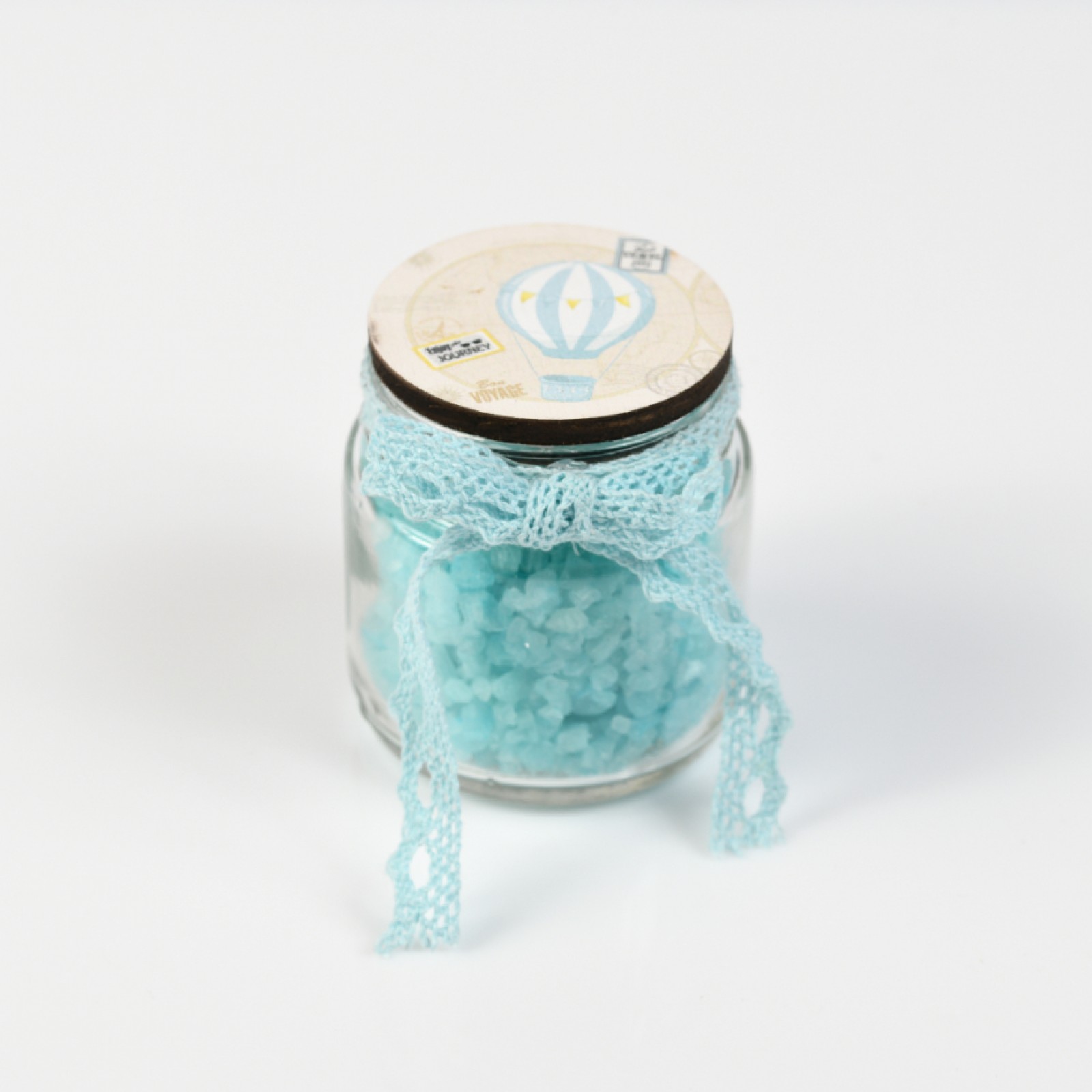 Μπομπονιέρα βαζάκι με αρωματικά άλατα και τυπωμένο σχέδιο αερόστατο. Χρώματα : λευκό, γαλάζιο, βεραμάν, aqua, πετρόλ, navy blue, ιβουάρ