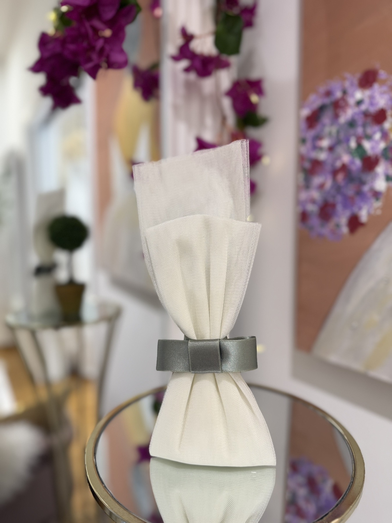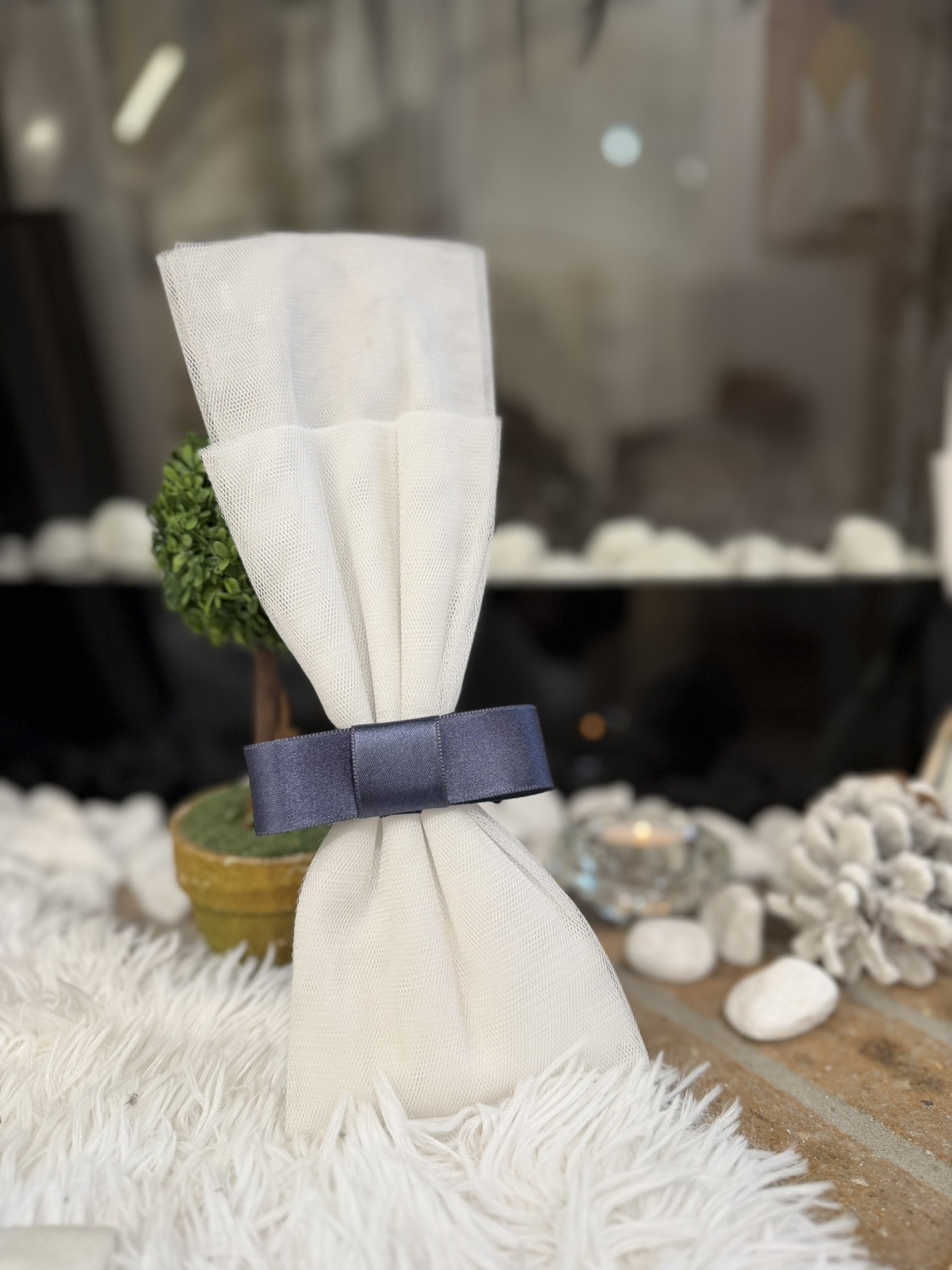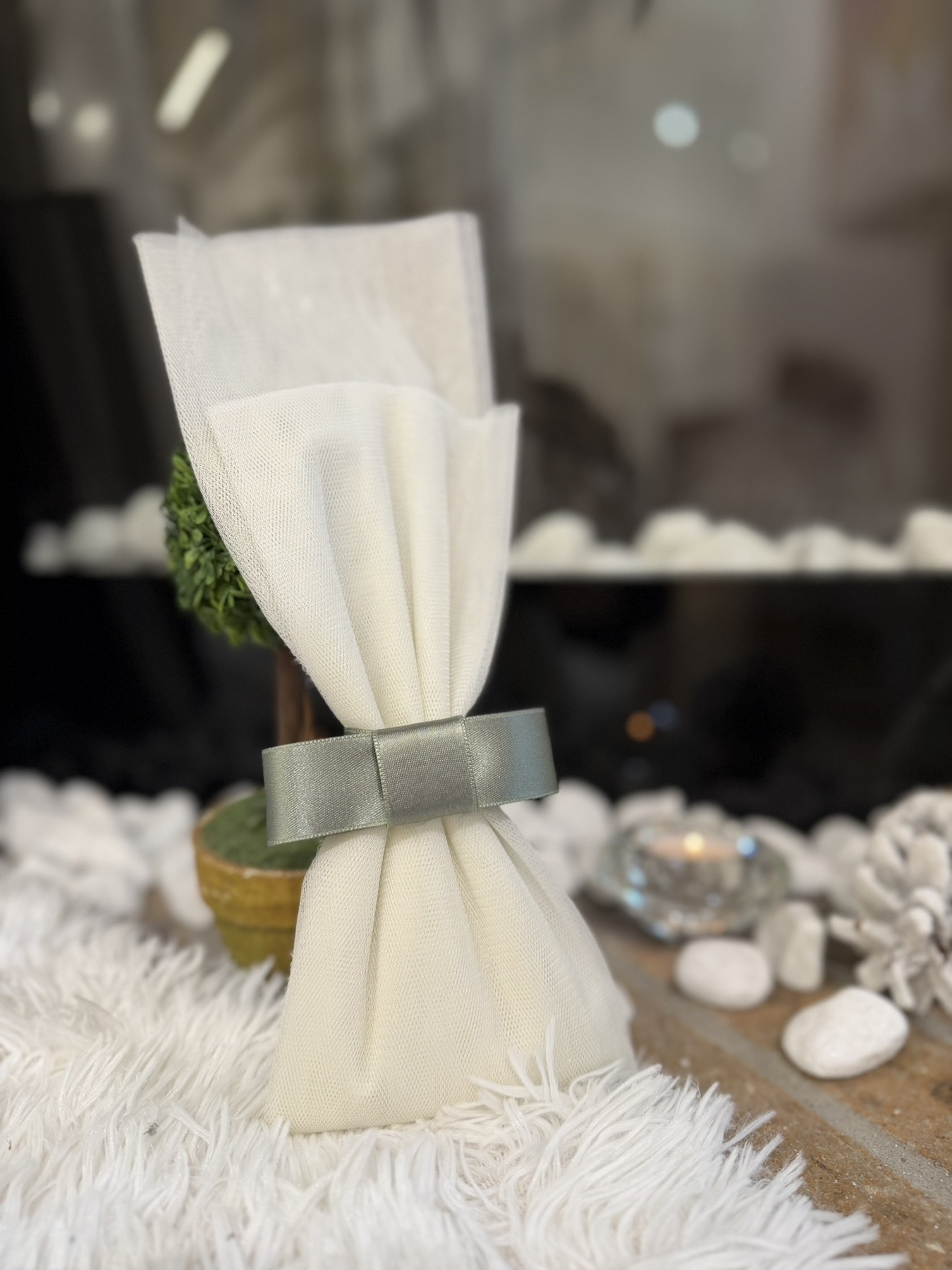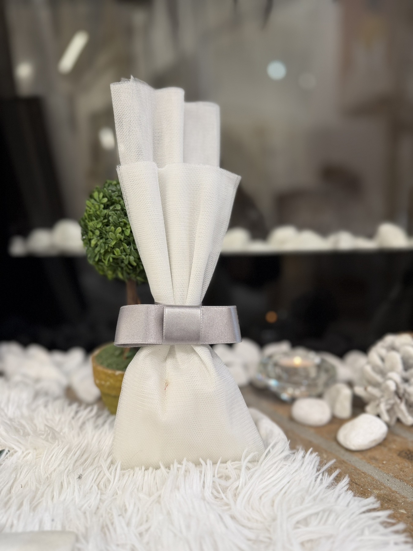 Μπομπονιέρα Γάμου Τούλι Ύφασμα με Κορδέλα υπάρχει δυνατότητα επιλογής χρώματος στις κορδέλες.