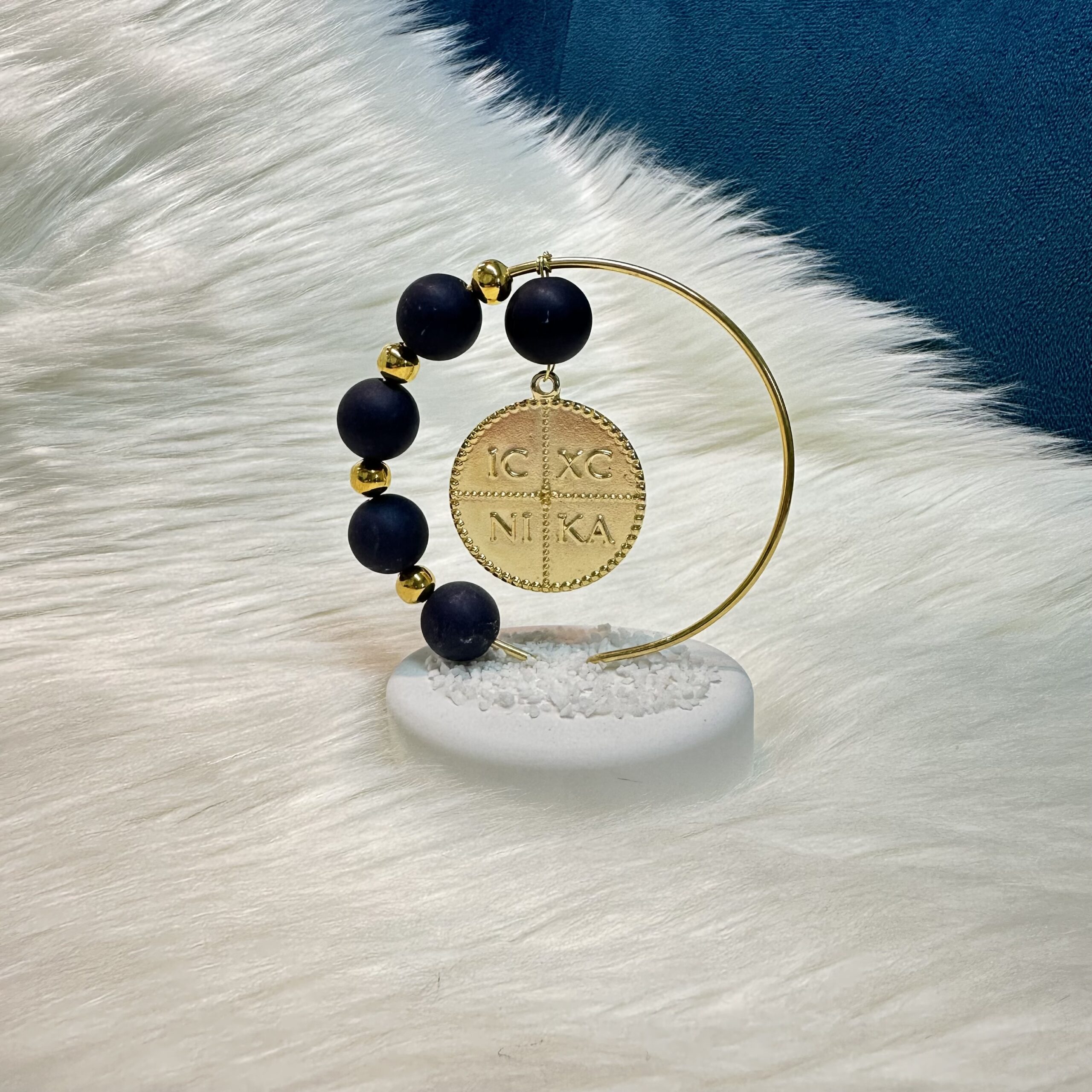 Μπομπονιέρα με κωνσταντινάτο σε τεχνητό βότσαλο. Περιέχει μπλε και χρυσές χάντρες
