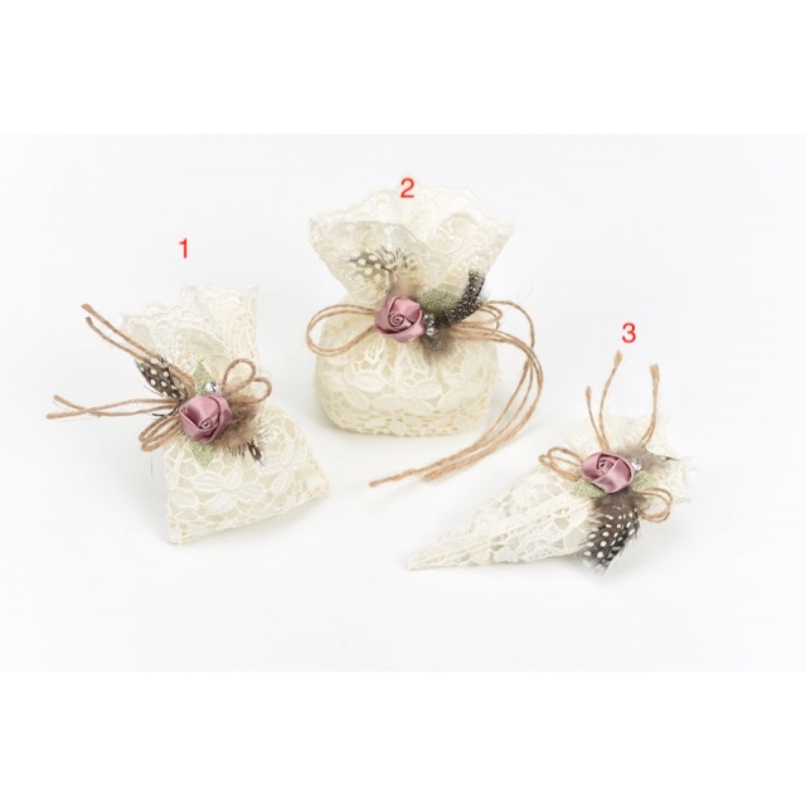 Μπομπονιέρα πουγκί κιπούρ δαντέλα Νο1 και σύνθεση με φτερά και σατέν λουλούδι σε χρώμα σάπιο μήλο. Χρώμα λευκό. Διαστάσεις 11x6cm